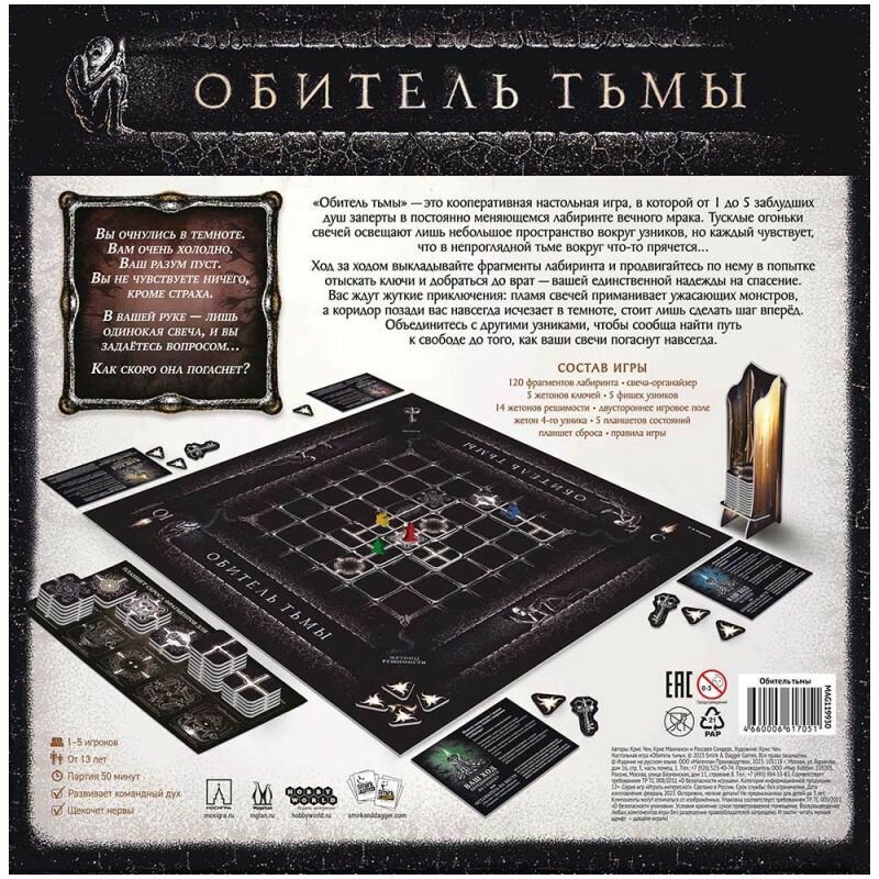 "Обитель тьмы" это кооперативная настольная игра, в которой от 1 до 5 заблудших душ заперты в постоянно меняющемся лабиринте вечного мрака. Тусклые огоньки свечей освещают лишь небольшое пространство вокруг узников, но каждый чувствует, что в непроглядной тьме вокруг что-то прячется.