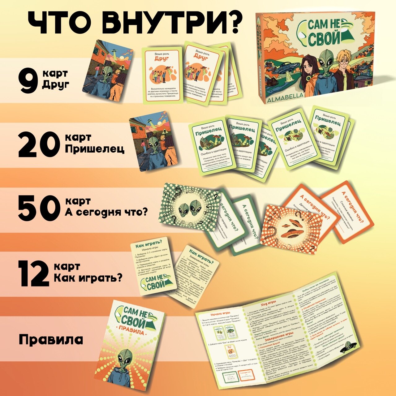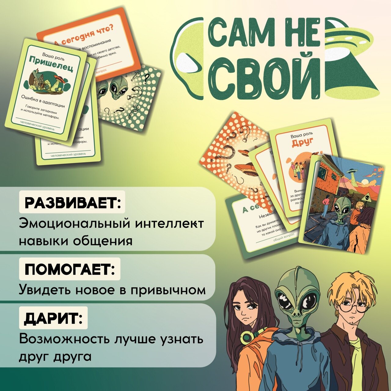 «Сам не свой» — настольная игра для компаний от 4 до 12 человек, развивающая навыки коммуникации, наблюдательность и эмоциональный интеллект. Отлично подходит для увлекательного досуга в компании друзей или с семьей