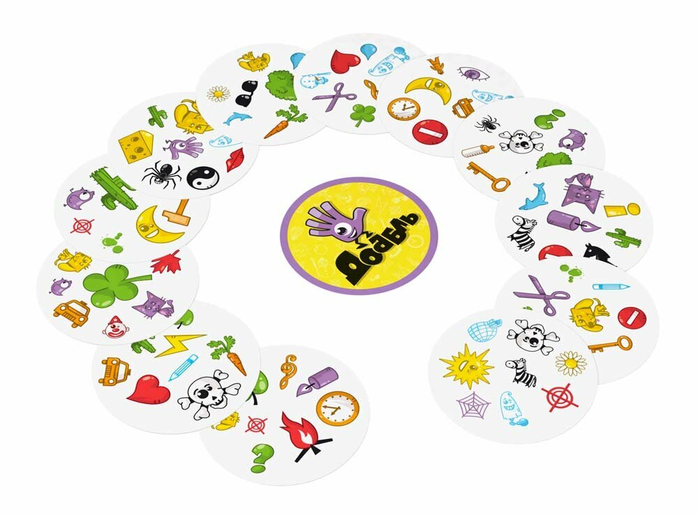 Невероятно! Доббль – это более 50 символов, 55 карточек, 8 символов на каждой карточке и всегда только один общий символ у двух любых карточек!