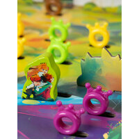 игровое поле, 59 карт, 90 жетонов монет, 5 персонажей, 5 подставок под персонажей, 2 кубика, свод законов