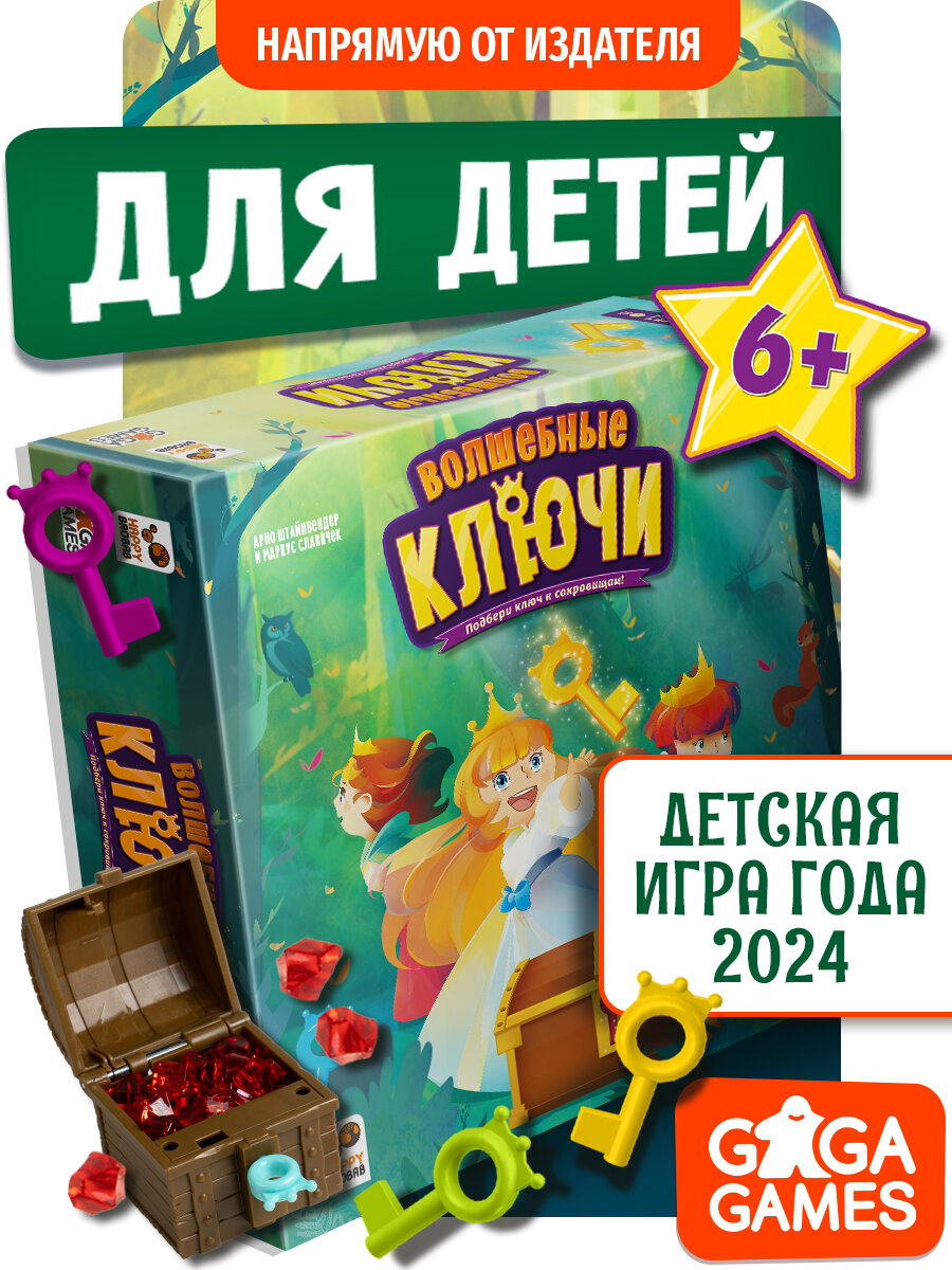 Волшебные Ключи – это веселая и азартная настольная игра для детей от 6 лет и всей семьи, в ходе которой вы станете искателями сокровищ в магической роще и постараетесь найти как можно больше ключиков, подходящих к сундуку с заветными драгоценностями. Отличное оформление и титул Лучшей детской игры 2024 года – эта коробочка завоевала сердца настольщиков разных возрастов со всего света! В партиях этой милой и быстрой настолки вы отправитесь в путешествие с кубиками по необычной чаще, в которой спрятано множество особых ключей, что могут отпереть специальный ларец с богатствами. Но не радуйтесь заранее – настоящие ключики перепутались с фальшивыми и теперь никто попросту не знает, какие из них подходят, а какие нет! Так что скорее бросайте кубы и продвигайтесь вперед по извилистому игровому полю, подбирая различные ключики и пытаясь открыть ими тот самый ларчик. Удалось – получаете соответствующую награду, нет – попробуете снова в следующий ход, сохранив фальшивый ключ ради восстановления так не вовремя закончившихся кубиков. В конце поля вас ждет золотой ключ, который гарантированно открывает сундучок и гарантирует большой куш – но борьба за него развернется нешуточная и сумеете ли вы заполучить его первым? Эта настолка позволит мальчикам и девочкам прокачать мелкую моторику, навыки счета и умение принимать логические решения, а компоненты высокого качества сделают ее отличным пополнением любой настольной коллекции. Играть можно вдвоем, втроем или вчетвером в компании детей, подростков и взрослых.