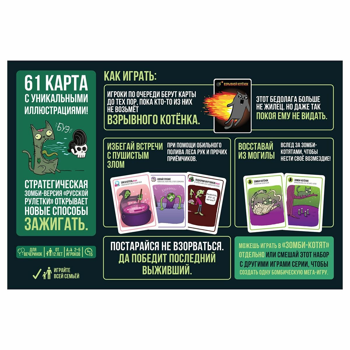 Настольная игра "Взрывные котята: зомби-котята" - это карточная игра, которая предназначена для 2-5 игроков в возрасте от 3 до 18 лет.