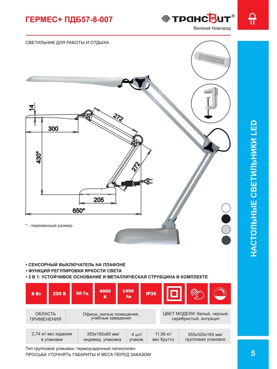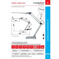 | Дополнительная информация | Основание (подставка): есть,Струбцина: есть,Пантограф: есть,Форма основания: прямоугольное,Диаметр основания: 20,5,Высота основания, см: 4,5,Преимущества основания: Утяжеленное основание,Преимущество струбцины: не занимает много места на столе,Преимущество пантографа: Лёгкая манёвренность и устойчивость,Диаметр арматуры пантографа, см: 1,Длина верхнего звена рамы пантографа, см: 27,2,Длина нижнего звена рамы пантографа, см: 27,2,Части стойки:: пантограф; ,Цвет струбцины: черный,Блеск струбцины: глянцевый,Цвет пантографа (палитра ТД Трансвит): черный,Блеск пантографа: глянцевый,Цвет провода: черный,Цвет плафона: черный,Блеск плафона: матовый,Высота расположения выхода провода на корпусе, см: 2,Расположение выхода провода: низ,Преимущество расположения выхода провода: Расположение снизу исключит лишние акценты в интерьере,Род выключателя: сенсорное управление,Вид выключателя : сенсорный,Особенности выключателя: включение-выключение и плавное изменение яркости прикосновением,Расположение выключателя: на корпусе,Расположение выключателя на корпусе: на плафоне,Питание: от сети,Напряжение, В: 220,Вид питания OZON: От сети 220В,Форма плафона: дорожка,Длина плафона , см: 30,Диаметр плафона внутренний, см: 5,8,Цветовая температура, К (разд. - точка): 4000,Свет OZON: дневной белый,Сборка (требуется?): есть,Количество этапов сборки: 2,Время сборки: 1 мин 43 сек,Преимущество веса: Вес придает устойчивость конструкции,Материал изделия (склейка): корпус - пластик; ,Материал струбцины: металл,Декоративные элементы: плавная форма;закругленные края; продольный рельеф; сенсорный выключатель;закругленные углы; фиксатор пантографа,Наличие батареек в комплекте: батарейки не требуются; нет; не требует батареек,Лампочка в комплекте: лампочка входит в комплект,Комната: Кабинет; Офис; Спальня,Вид деятельности: для чтения; для ухода за собой - маникюра; для учебы; для работы; для хобби - вышивания, вязания,Стили интерьеров: классический,современный;хай-тек |