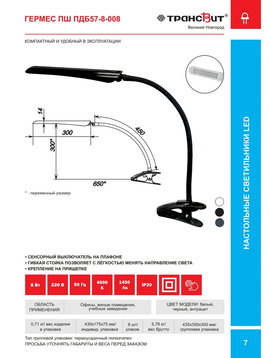 | Дополнительная информация | Прищепка: есть,Гибкая стойка: есть,Преимущества основания: Утяжеленное основание,Амплитуда струбцины (макс. толщина столешницы), см: 5,5,Длина струбцины, см: 6,Преимущество прищепки: экономит много места,Амплитуда прищепки (макс.высота поверхности), см: 4,Длина прищепки, см: 15,Преимущество гибкой стойки: позволяет легко направлять свет в нужную сторону,Высота гибкой стойки, см: 45,Части стойки:: гибкая стойка; ,Цвет прищепки: антрацит,Цвет гибкой стойки (палитра Трансвит): антрацит,Блеск гибкой стойки: матовый,Цвет провода: черный,Цвет плафона: антрацит,Блеск плафона: глянцевый,Высота расположения выхода провода на корпусе, см: 2,Расположение выхода провода: низ,Преимущество расположения выхода провода: Расположение снизу исключит лишние акценты в интерьере,Род выключателя: сенсорное управление,Вид выключателя : сенсорный,Особенности выключателя: включение-выключение,Расположение выключателя: на корпусе,Расположение выключателя на корпусе: на плафоне,Питание: от сети,Напряжение, В: 220,Вид питания OZON: От сети 220В,Форма плафона: дорожка,Длина плафона , см: 30,Диаметр плафона внутренний, см: 6,4,Цветовая температура, К (разд. - точка): 4000,Свет OZON: дневной белый,Сборка (требуется?): есть,Количество этапов сборки: 2,Время сборки: 1 мин 45 сек,Преимущество веса: Вес придает устойчивость конструкции,Материал изделия (склейка): корпус - пластик; ,Материал прищепки: пластик,Декоративные элементы: закругленные края; продольный рельеф; сенсорный выключатель;силиконизированое покрытие,Наличие батареек в комплекте: батарейки не требуются; нет; не требует батареек,Лампочка в комплекте: лампочка входит в комплект,Комната: Кабинет; Офис; Спальня,Вид деятельности: для чтения; для ухода за собой - маникюра; для учебы; для работы; для хобби - вышивания, вязания,Стили интерьеров: классический,современный;хай-тек |