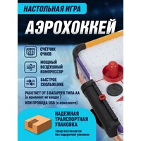 Настольная игра "Аэрохоккей" выполнен из качественного и безопасного материала - дерева. Игра оснащена компрессором, который работает от батареек или любой USB-розетки (кабель в комплекте) и позволяет шайбе беспрепятственно скользить по поверхности, что добавляет игре еще большей динамики! У каждого игрока есть механический счетчик забитых голов. Стол оснащен длинными ножками. Аэрохоккей станет отличным подарком и развлечением для всей семьи. Игра очень подвижная и помогает развивать скорость реакции, ловкость, умение быстро перестраивать внимание. В комплект входят: 2 биты и 2 шайбы, USB-кабель Размер: 81*43,5*10,1 см Тип питания: От батареек или USB Страна изготовления: Китай