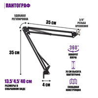Характеристики: - Усиленная струбцина исключает выгибание при креплении к поверхности; - Длина стойки: 66 см; - Нагрузка на стойку: до 1.6 кг; - Размеры (в собранном состоянии): 13.5x4.5x40 см; - Внешняя резьба переходника: 1/4"; - Внутренняя резьба переходника: 3/8"; - Резьба стойки: 3/8"; - Диаметр переходника: 1.5 см; - Высота переходника: 2 см; - Макс. ширина зажима для крепления к столу - 5.5 см.