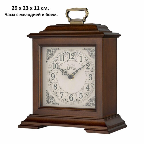 Настольные часы с боем Tomas Stern 9107 артикул: Tomas Stern 9107 Настольные часы оснащены надежным кварцевым механизмом. Циферблат закрыт стеклом. Корпус выполнен из массива дерева, искусственно состарен. Размер : 29 х 23 х 11 см. Настольные часы Tomas Stern 9107 Комплектация: Часы, инструкция на русском языке, упаковка. Кварцевые настольные часы с мелодией и боем Tomas Stern 9107. Корпус классической формы изготовлен из массива и тонирован в коричневом цвете. Циферблат с арабской оцифровкой украшен изящной росписью и аккуратными ажурными стрелками. Музыкальный блок часов предоставляет на выбор следующие варианты мелодии и боя: «Westminster» по четвертям, «Westminster» только в ровный час, «Ave Maria» только в ровный час и «Bim-Bam», регулируемая громкость, автоматическое ночное отключение мелодии и боя. В часах установлен тихий, точный и надежный механизм Young Town 12888 c дискретным ходом. Необходимо 3 элемента питания типа АА (в комплект не входят). Мелодия : Westminster