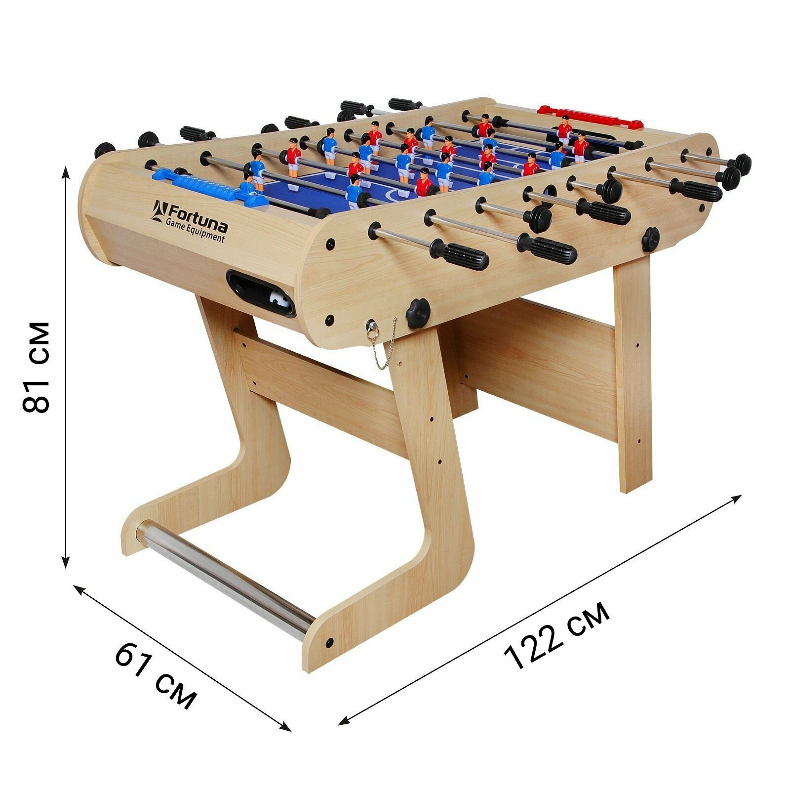 Характеристики настольного футбола для детей Fortuna AztekaFDL-420:• Тип игры: настольный футбол / кикер• Размещение: напольное• Габариты: 122 х 61 х 81 см• Игровое поле: 104 х 58 см• Счетчик очков: есть, ручной• Регулировка высоты стола: нет• Складная конструкция: да• Материал корпуса, опор и игрового поля: износостойкий МДФ, термо покрытие• Материал рукояток: пластик• Материал штанг: металл хромированный• Тип штанг: сквозной• Диаметр штанг: 12,7 мм• Материал игроков: ударопрочный полимер• Материал мячей: ударопрочный полимер• Диаметр мячей: 31 мм• Фирменная система PlayerSafety: есть• В комплект входит: Игрок Fortuna 09425-BLWL– 11 шт, Игрок Fortuna 09423-RWL– 11 шт, штанга – 8 шт, мяч – 4 шт.• Вес футбола: 24 кг• Бренд: Fortuna Game Equipment (Россия)внимание! Настольный футбол Fortunaпоставляется в частично собранном виде. Окончательный монтаж осуществляется собственными силами покупателя, без привлечения специалистов. В комплекте со столом поставляется иллюстрированная инструкция по сборке и правилами игры на русском языке, которая существенно облегчает и ускоряет монтаж. Настольный футбол / кикер не предназначен для коммерческого использования.