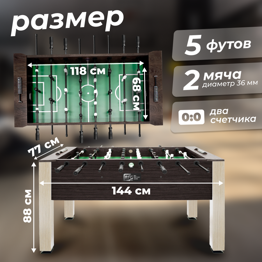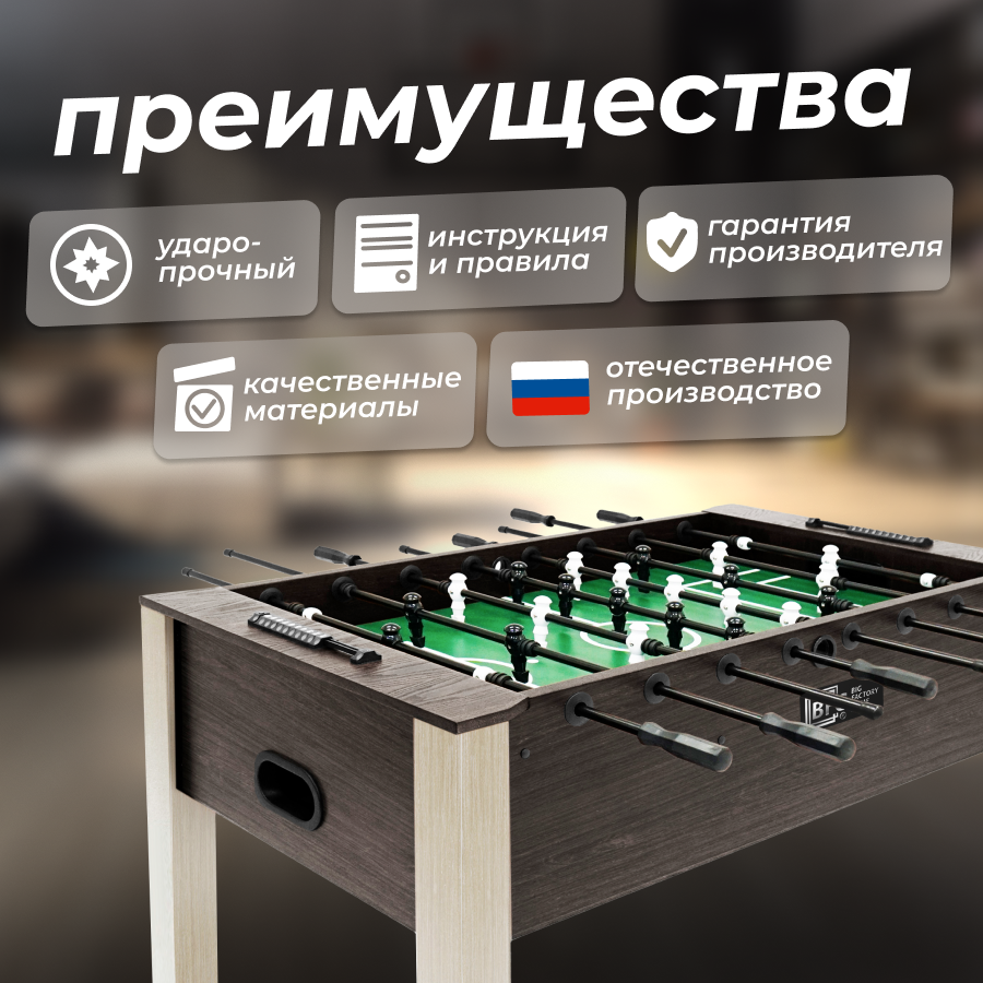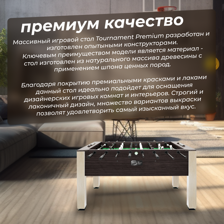 Стол оборудован профессиональными штангами и стилизованными фигурками игроков, выполненными из долговечных и прочных материалов. Ключевым преимуществом модели является материал - стол изготовлен из натурального массива древесины с применением шпона ценных пород.