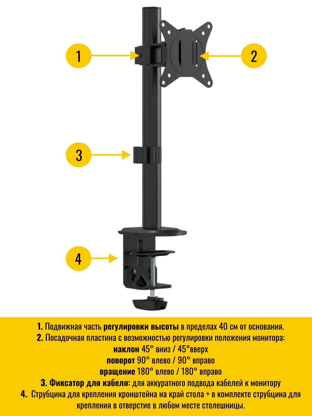 - Вращение 180° для портретного режима. ✔ 2 типа крепления в комплекте: струбцина на край стола + втулка для отверстия в столешнице. ✔ Универсальный VESA: идеален как кронштейн для монитора 75х75 и кронштейн для монитора 100x100 (поддержка vesa 75x75 для монитора, vesa 100x100 для монитора). ✔ Высота 407 мм + кабель-канал для аккуратного вида. ✔ Надежная стойка для монитора на стол с нагрузкой до 9 кг — подходит даже для кронштейн для монитора 32 дюйма или кронштейн для монитора 27 дюймов.