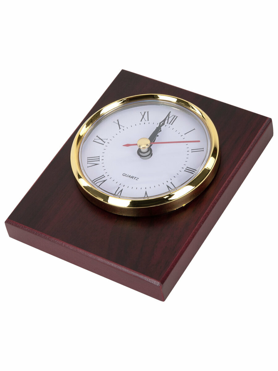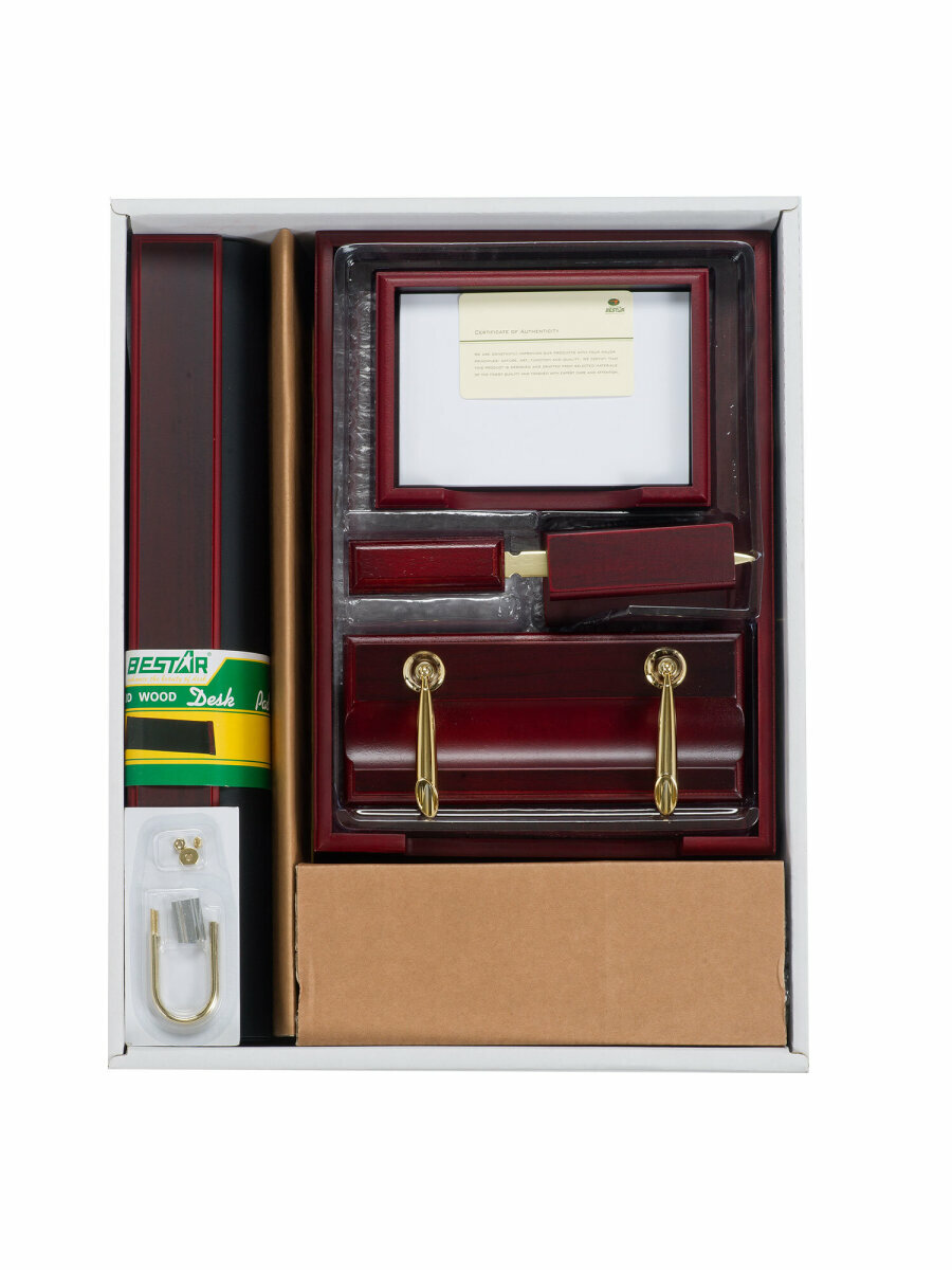 Набор состоит из 10 предметов: двойной лоток для бумаг, коврик для письма (размер - 60х42 см), подставка для ручек (2 шариковые ручки в комплекте), стакан-подставка для письменных принадлежностей, подставка для бумажного блока, подставка для визиток, нож для вскрытия конвертов, подставка для перекидного календаря, фоторамка, часы. Все предметы изготовлены из дерева красного цвета с золотистой фурнитурой. Набор упакован в подарочную коробку.