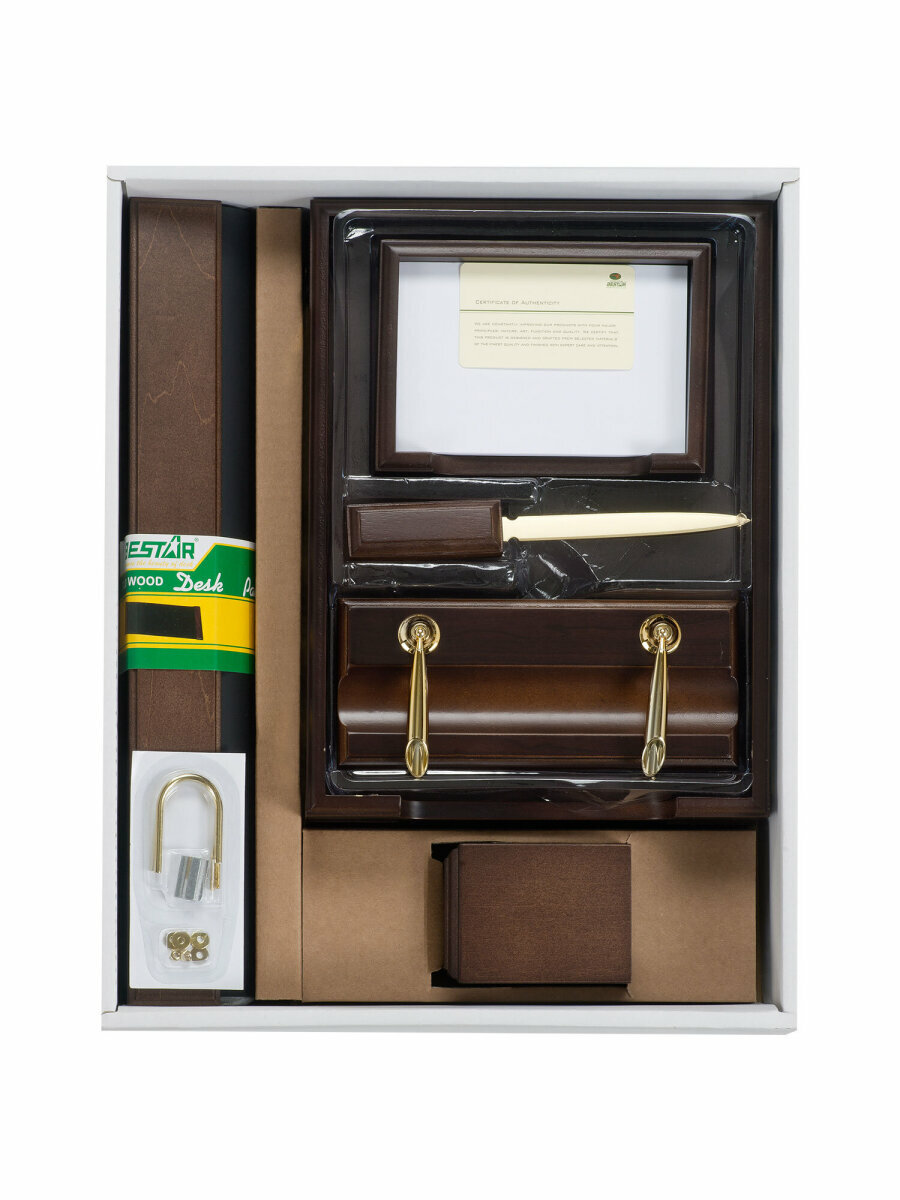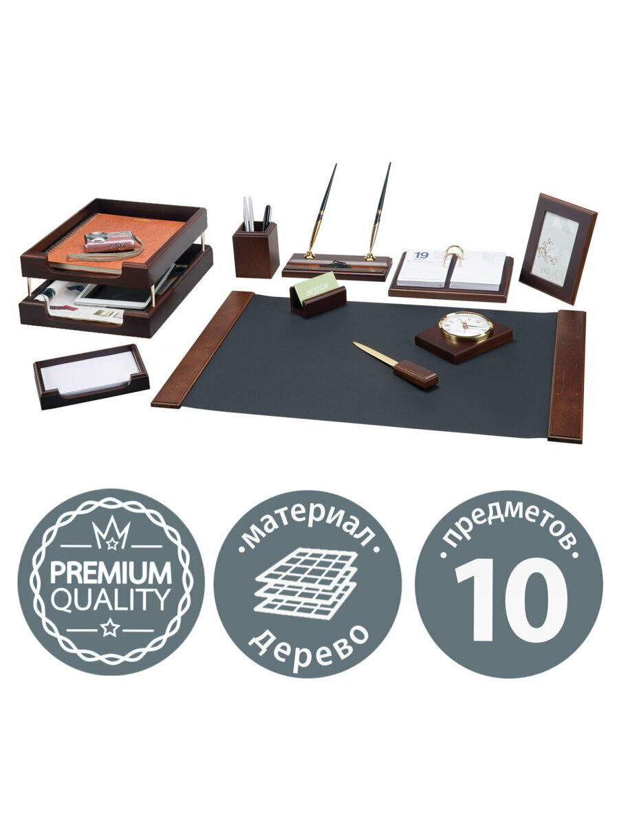 Настольный набор премиум-класса BESTAR Artemis оригинальный подарок, отличающийся утонченным стилем и совершенством деталей. Набор состоит из 10 предметов: двойной лоток для бумаг, коврик для письма (размер - 60х42 см), подставка для ручек (2 шариковые ручки в комплекте), стакан-подставка для письменных принадлежностей, подставка для бумажного блока, подставка для визиток, нож для вскрытия конвертов, подставка для перекидного календаря, фоторамка, часы. Все предметы изготовлены из дерева цвета "орех" с золотистой фурнитурой. Набор упакован в подарочную коробку. Настольный набор BESTAR Artemis подчеркнет изысканный вкус и статус владельца. Приобрести его можно в нашем интернет-магазине.