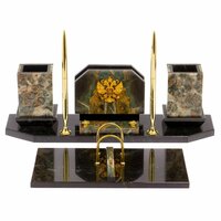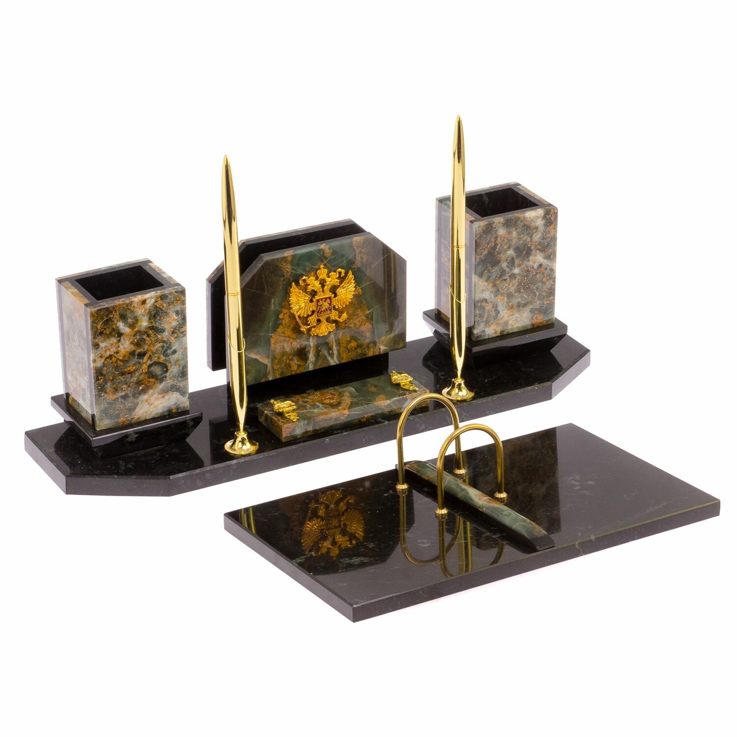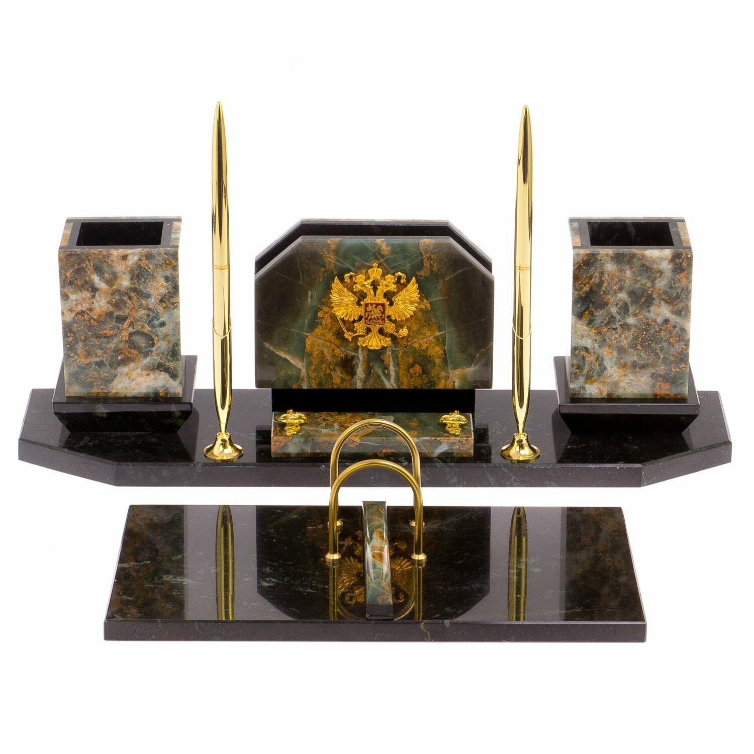 Настольный набор "Герб России" из офиокальцита размером центр 39х10х12 см, календарница 26х16х2 см и весом 6000 г.