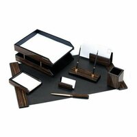 Состав набора: Подкладка на стол 66.5 х 44 см, подставка для ручек с 2 ручками, подставка для бумаги для записей, подставка для визиток, нож для бумаг, подставка для писем, подставка для пишущих принадлежностей, лоток для бумаг.