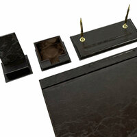 В состав набора входят горизонтальный лоток А4 для документов, подставка под бумажный блок 9х9 см "Кубарик", стаканчик для карандашей, подставка с 2 ручками, настольный коврик с откидывающейся верхней частью и подставка для смартфона. Все предметы выполнены из эко-кожи Premium, что делает их прочными и долговечными.
