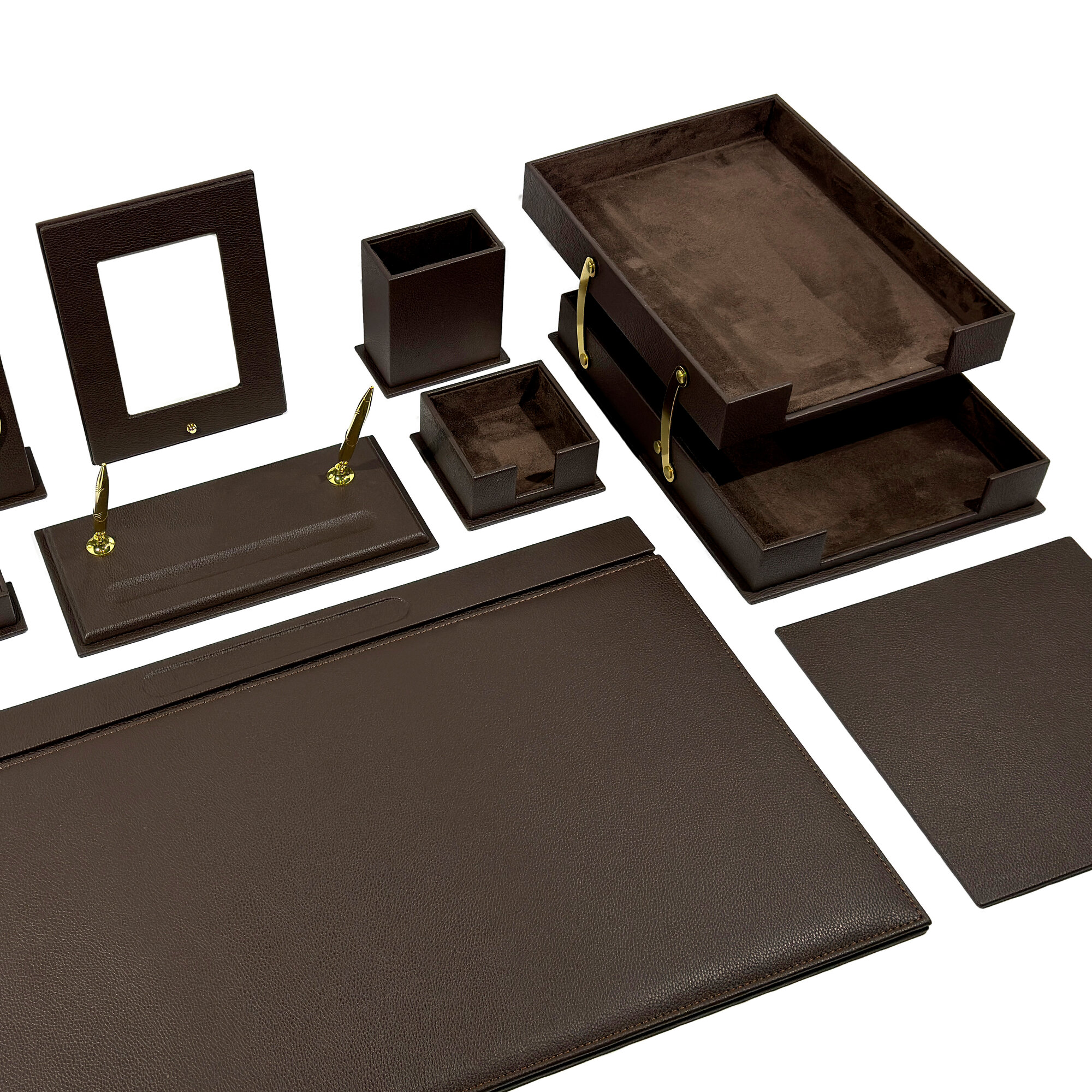 - Стильный дизайн: коричневый цвет и искусственное кожаное покрытие придают набору элегантный и респектабельный вид. - Удобство использования: все предметы легко размещаются на столе и обеспечивают быстрый доступ к необходимым вещам. - Практичность: набор содержит все необходимое для работы и хранения, что позволяет сэкономить время и место на рабочем столе. - Экологичность: материал, из которого изготовлен набор, не содержит вредных веществ и является безопасным для здоровья.