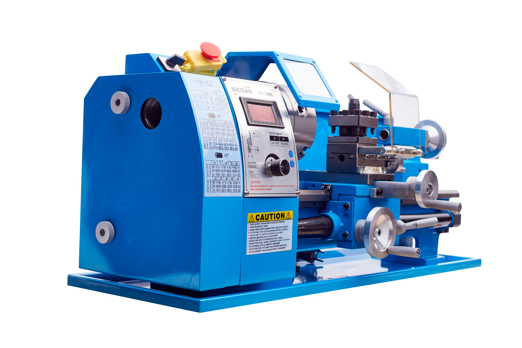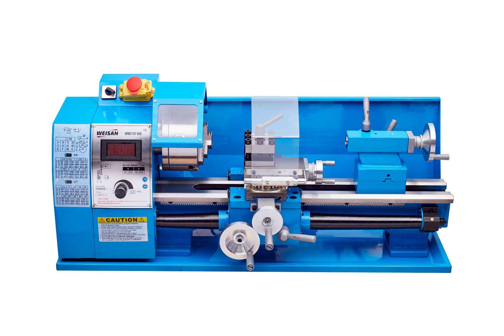 Токарно-винторезный станок WEISAN WM210F400 - это компактный настольный инструмент. Он предназначен для бытовой (хоббийной) токарной обработки заготовок из металлов или пластмасс с поверхностями, имеющими форму тел вращения. Позволяет выполнять основные токарные операции проточку и расточку цилиндрических и конических поверхностей, подрезку торцев, отрезку, сверление, нарезку резьбы. Идеально подходит для точной обработки металлических деталей и сверлильных работ. Для создания опытных образцов и выполнения моделирования, как на большом производстве, так и дома, в гараже и ремонтных мастерских. Подойдёт для начинающих и опытных токарей. WM210F оборудован всем необходимым для работы. Работает в двух скоростях вращения заготовки. Электронное торможение и возможность мгновенного изменения направления. С помощью шестерен переключения можно изменять скорость подачи и точно выполнять нарезку широкого диапазона резьбы. Мини станок предлагает лучший крутящий момент и при этом работает тихо. Оснащен бесщеточным двигателем с мощностью 1100Вт. Защитным кожухом ходового винта и защитным экраном резцедержателя. На панели имеется дисплей, который отображает число оборотов. А также ручка для их регулировки. Основание станка закалено и отшлифовано. Комплектуется упорными центрами, набором резцов и шестерней, сверлильным патроном.