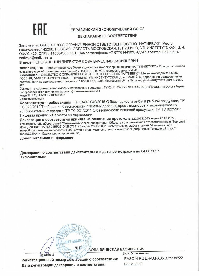 Специализированный продукт из бурой водоросли фукус, который, за счет входящих в него веществ органического происхождения, естественным образом очищает организм, при этом восполняет нехватку всех жизненно необходимых витаминов и минералов. Натив-детокс является эффективным средством для выведения из организмов токсинов различной природы. Основными действующими биологически активными веществами, определяющими лечебно-профилактические свойства продукта, являются: йод в органической форме, альгиновые кислоты и их соли, фукоидан, витамины и макро- и микроэлементы, в том числе экстракт овса, экстракт имбиря. Флоротанины и полифенолы фукуса дополняют продукт антиоксидантной активностью. Продукт изготовлен по инновационной технологии, без использования химических агентов и термической обработки. Не содержит консервантов, красителей, ароматизаторов.
