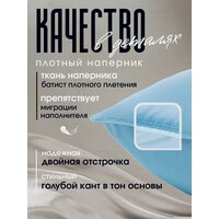 Чехол подушки изготовлен из 100% хлопка, что делает его мягким, пуходержащим и гипоаллергенным. Декоративные элементы, такие как атласный голубой кант, фирменная угловая лента и двойная отстрочка, придают подушке элегантный вид. Пломба подчеркивает качество и надежность продукта.