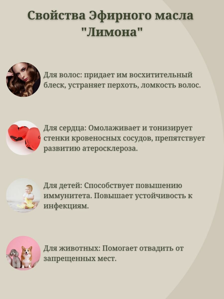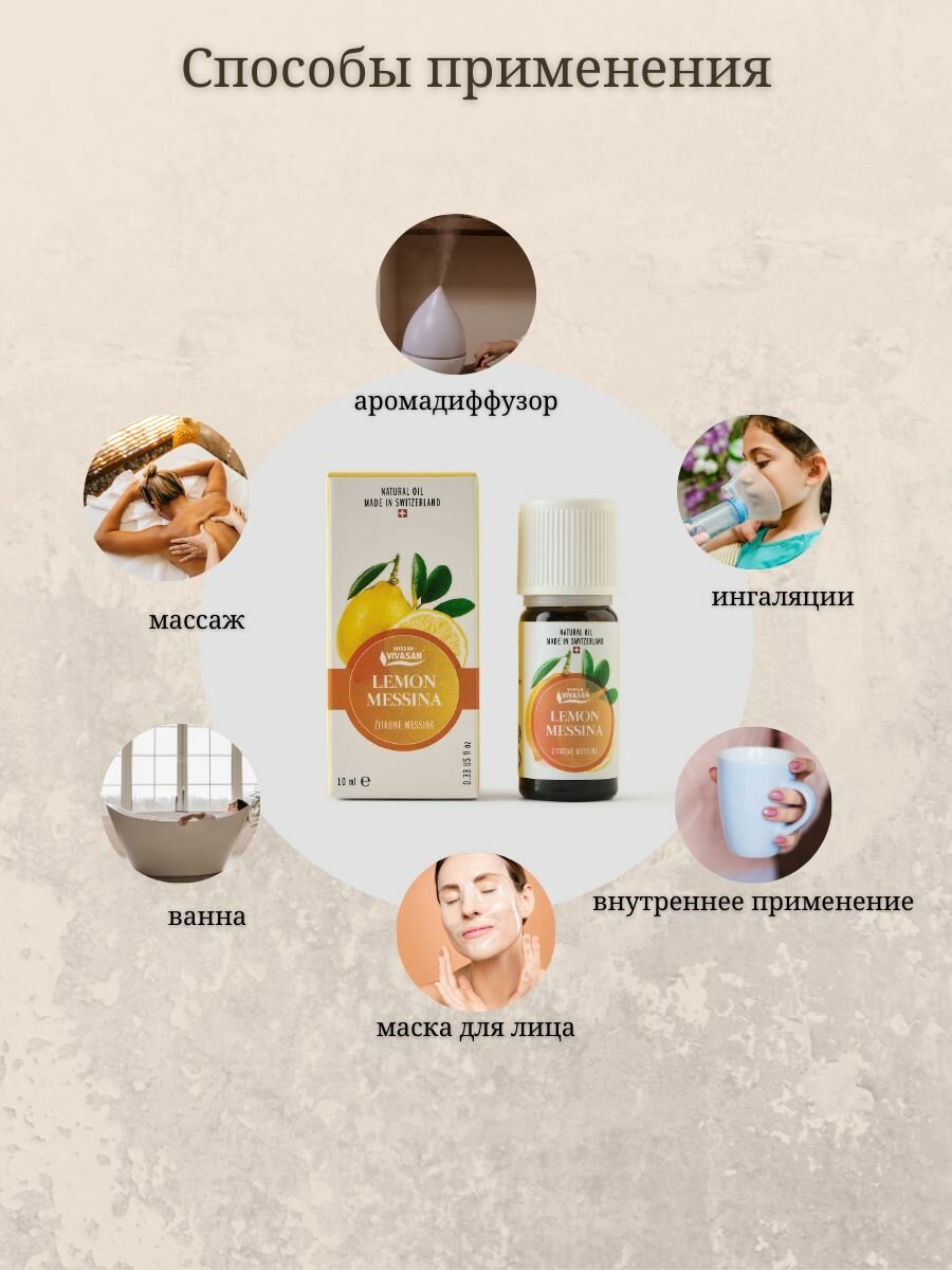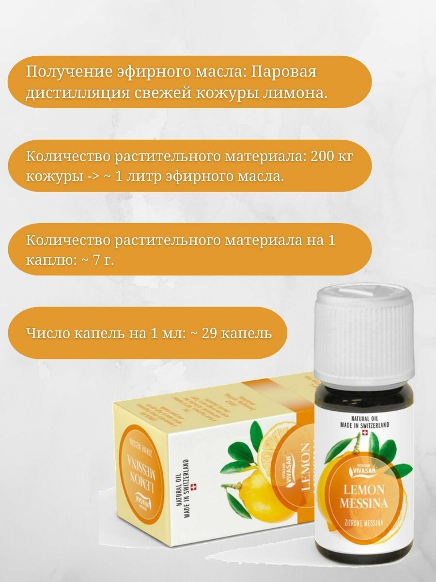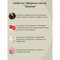 | Способ применения | ароматические ванны: 5-7 капель масла (при лечении простудных заболеваний, ревматизме, от целлюлита, для выведения шлаков, снижения веса). Аромалампа: 3-5 капель масла (от гипертонии, бессонницы, усталости, от простудных заболеваний, для нейтрализации табачного дыма). Массаж и растирание: 5-10 капель лимонного масла на 10 г массажного масла (при мышечных болях, ревматизме, варикозной болезни вен). Для ингаляций: 2-3 капли масла на 200 мл горячей воды, длительность 5-7 минут (при простудных заболеваниях). Компресс: 7-10 капель масла на 150 мл теплой воды (при варикозной болезни вен, герпесе, носовых кровотечениях). Полоскание: 2-3капли масла на стакан теплой воды (при ангине, пародонтозе, стоматите). Обогащение косметических средств: 5 капель масла на 5 г. косметической основы (при акне, пигментных пятнах, для отбеливания зубов). Внутреннее применение (возможно после врачебной консультации) по 1 капле 2 раза в день с соком или чаем (помогает при желчнокаменной и мочекаменной болезни, от головной боли, атеросклероза, гипертонии, для снижения веса, от пищевых отравлений и т.д.) |