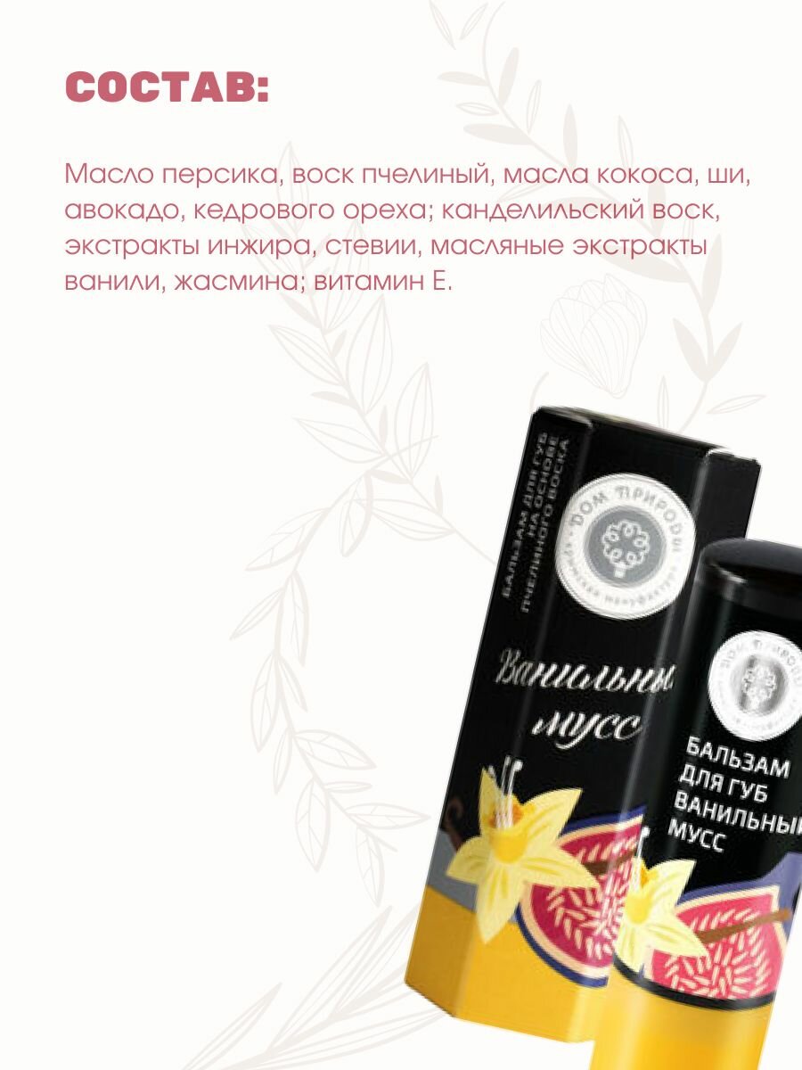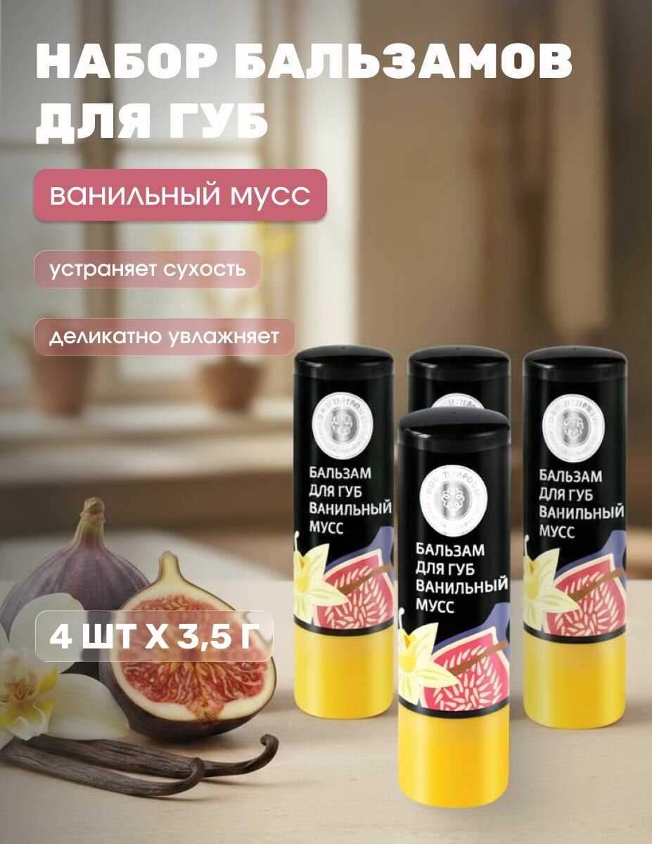 Натуральный бальзам для губ Ванильный мусс от сухости и шелушений, 4 шт х 3,5 г: сравнение цен, характеристики, фото, актуальное наличие и цены.