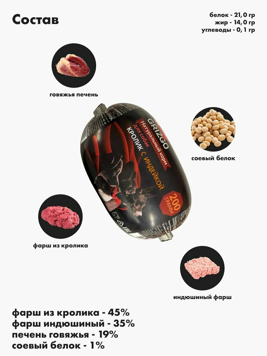 Это совершенно другой, здоровый и полезный видовой рацион , в составе которого естественные для животного продукты питания , диетический и богатый витаминами и минералами, без усилителей вкуса и консервантов, без добавления крови , только натуральные продукты приготовленные по специальной технологии сохраняющий их в течении длительного времени. Продукт полностью готов к употреблению. Рекомендуется использовать как самостоятельный продукт так и в сочетании с кашами. Хранение: При температуре от 4 до 35 градусов 180 суток. После вскрытия продукт рекомендуется хранить в холодильнике не более 48 часов. Почему GRIZGO? 1. Профилактика мочекаменной болезни 2. Мощный иммунитет 3. Здоровая кожа и шерсть 4. Здоровые и чистые зубы 5. Стабильное пищеварение 6. Полезно для всех.