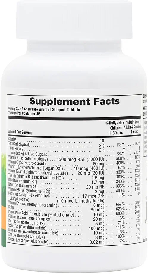 Калории 10 Всего углеводов 3 г Всего сахара 2 г Содержит 2 г добавленного сахара Витамин A (в виде бета-каротина) 1500 мкг RAE (5000 МЕ) Витамин C (в виде аскорбиновой кислоты) 60 мг Витамин D (в виде холекальциферола [веганского витамина D3]) 10 мкг (400 МЕ) Витамин E (в виде d-альфа токоферилацетата) 20 мг (30 МЕ) Тиамин (витамин B1) (в виде тиамина гидрохлорида) 1,5 мг Рибофлавин (витамин B2) 1,7 мг Ниацин (в виде никотинамида) 20 мг NE Витамин B6 (в виде пиридоксина гидрохлорида) 2 мг Фолат (в виде кальций-L-5-метилтетрагидрофолата) 17 мкг DFE (10 мкг L-метилфолата) Витамин B12 (в виде метилкобаламина) 6 мкг Биотин 50 мкг Пантотеновая кислота (в виде пантотената кальция) 10 мг Кальций (в виде аминоатного комплекса) 20 мг Железо (в виде аминоатного комплекса) 5 мг Йод (в виде йодида калия) 100 мкг 1 Магний (в виде аминоатного комплекса) 10 мг Цинк (в виде аминоатного комплекса) 3 мг
