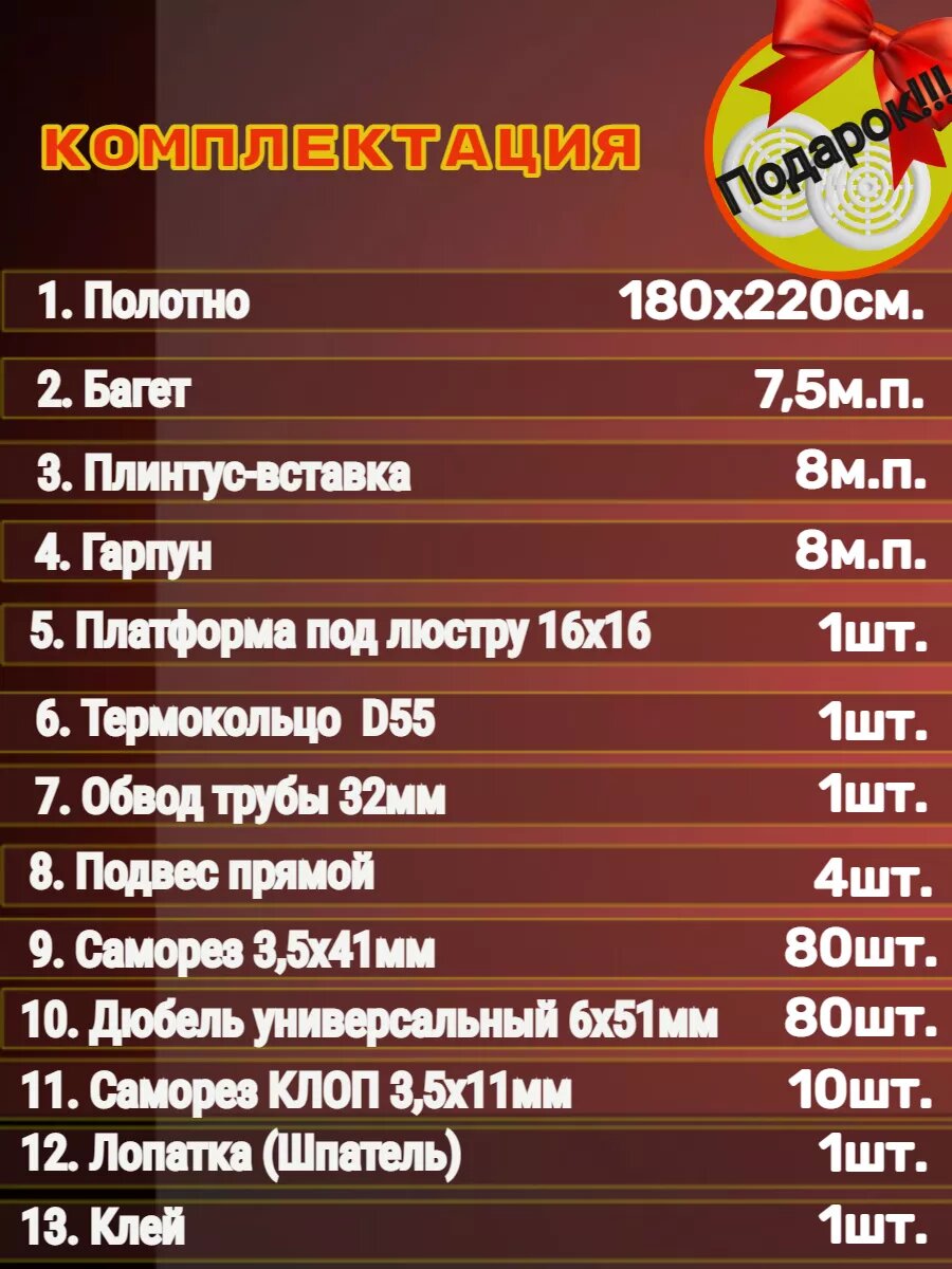 | Подробная комплектация | Полотно натяжного потолка, багет, гарпун, плинтус-вставка, платформа под люстру 16х16 см, подвесы для крепления люстры, термокольцо диаметром 55мм, пластиковый обвод трубы 32мм, суперклей, лопатка - шпатель для монтажа потолка деревянная, вентрешетки диаметр 50мм, крепеж (дюбель универсальный 6*51, саморез 3,5*41, саморез КЛОП 3,5*11) |