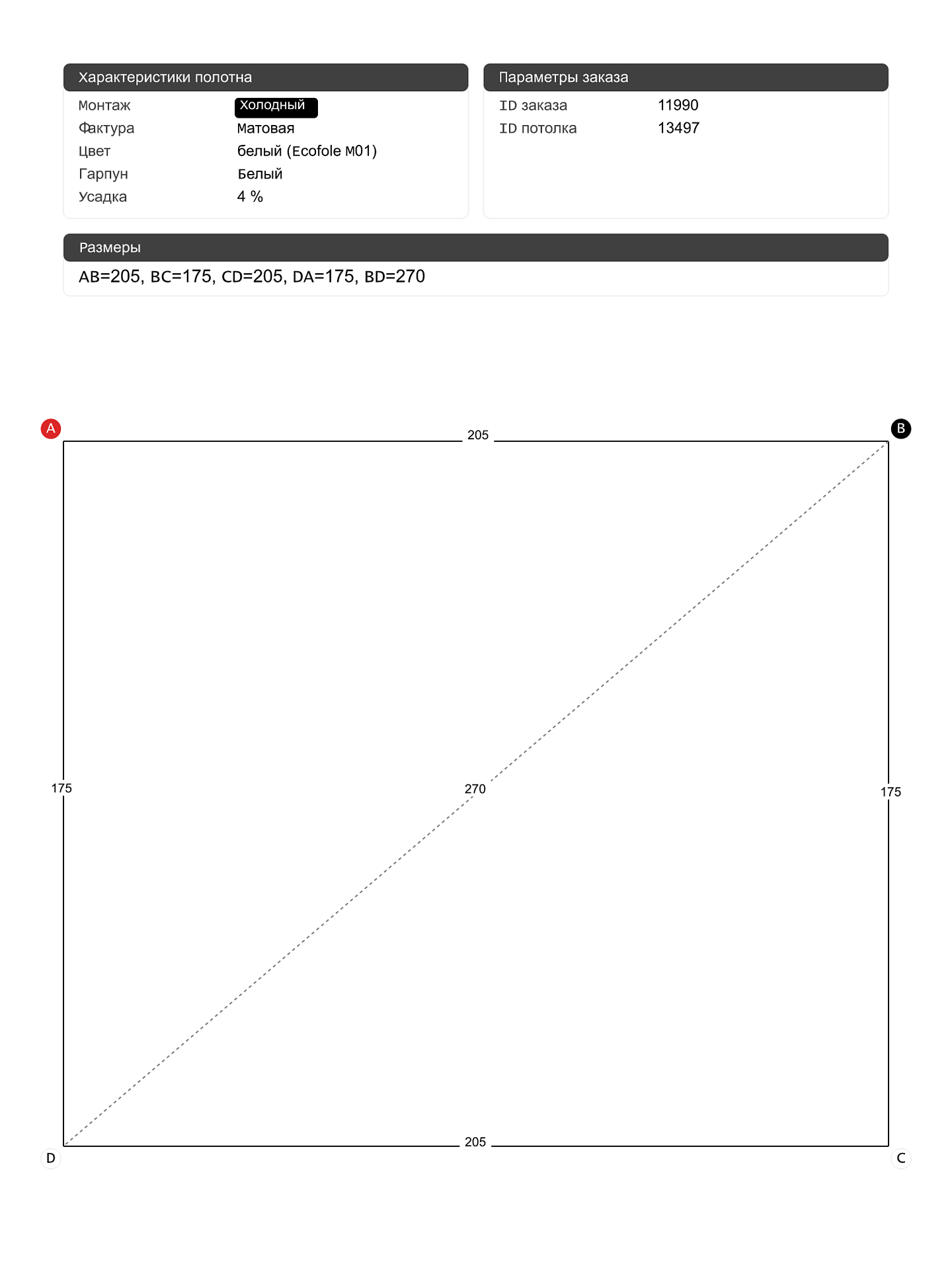 Натяжной потолок белый матовый, холодной натяжки, изготовленный по индивидуальным размерам, для помещения размером 205×175см