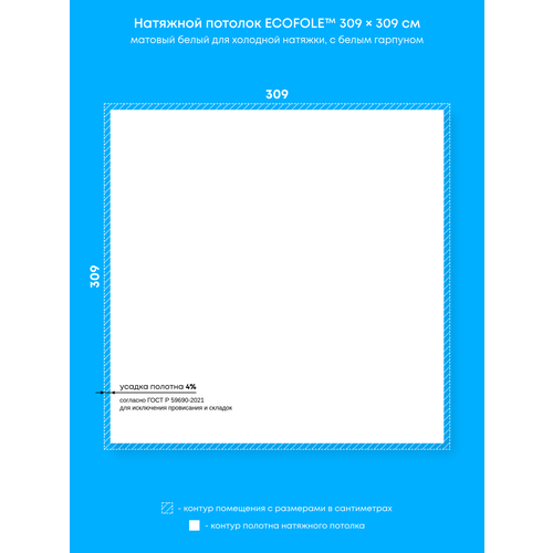 Натяжной потолок белый матовый, холодной натяжки, изготовленный по индивидуальным размерам покупателя, для помещения размером 309×309 см