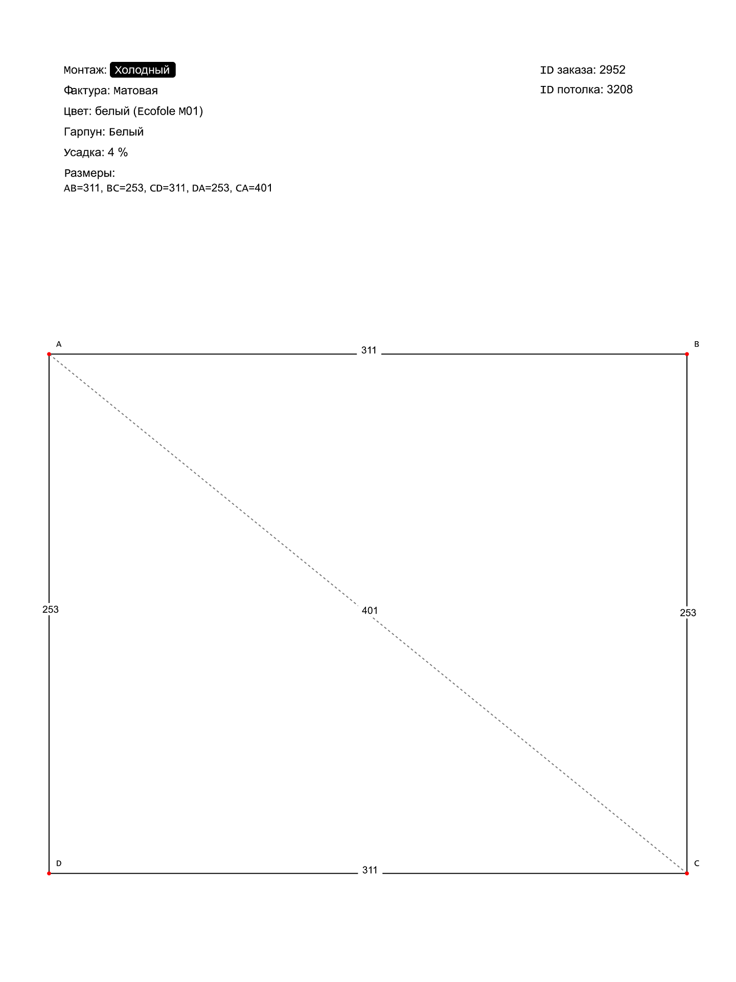 Натяжной потолок белый матовый, холодной натяжки, изготовленный по индивидуальным размерам покупателя, для помещения размером 311×253 см: сравнение цен, характеристики, фото, актуальное наличие и цены.