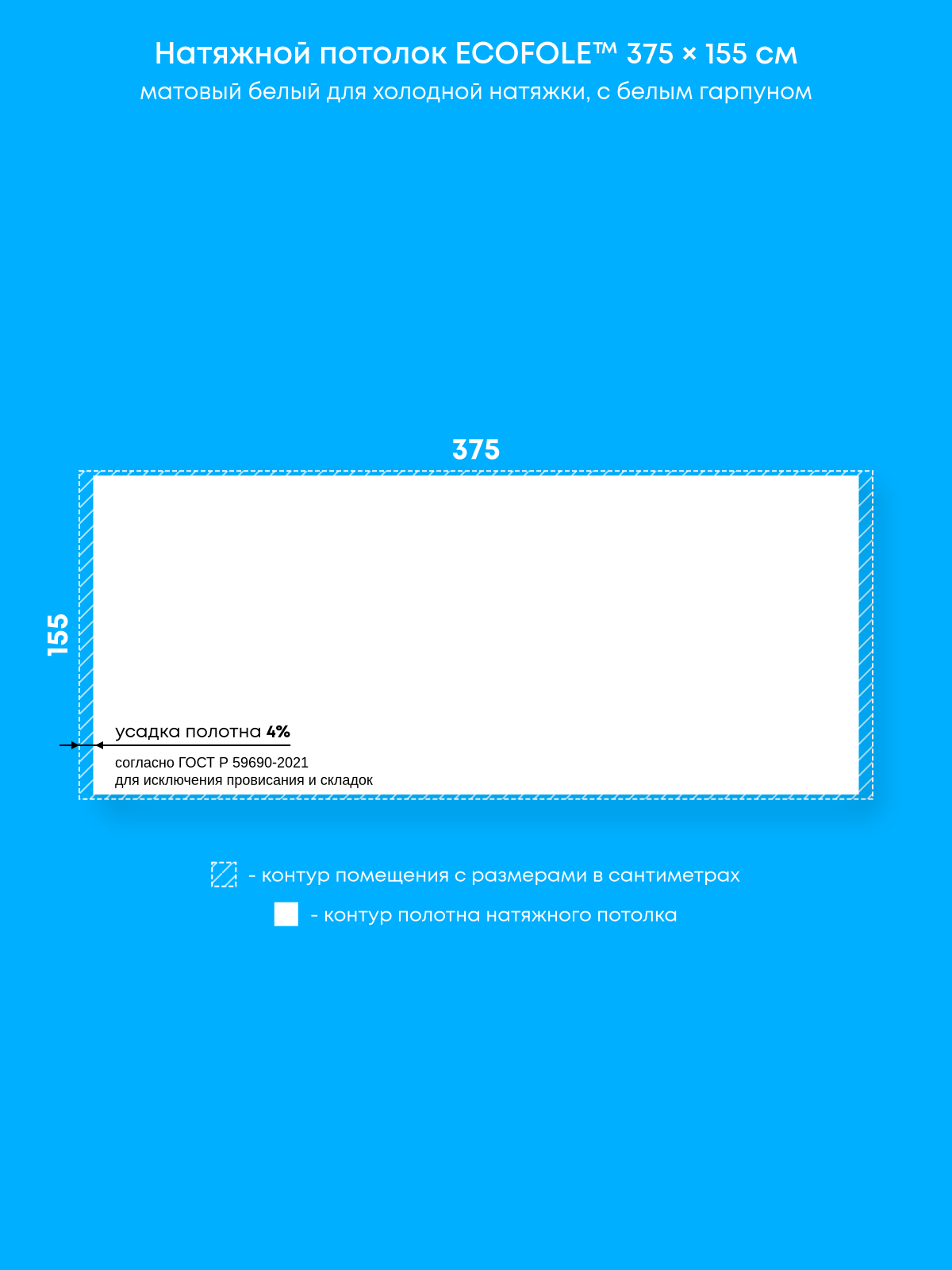 Натяжной потолок белый матовый, холодной натяжки, изготовленный по индивидуальным размерам покупателя, для помещения размером 375×155 см