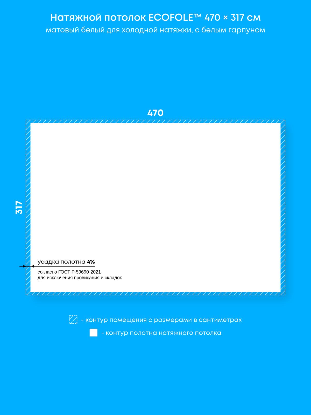 Натяжной потолок белый матовый, холодной натяжки, изготовленный по индивидуальным размерам покупателя, для помещения размером 470×317 см