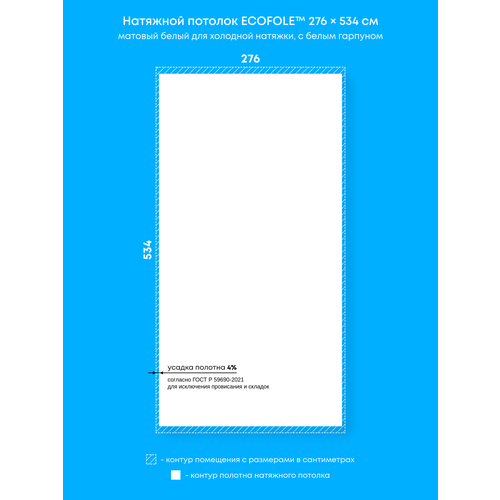 Натяжной потолок белый матовый, холодной натяжки, изготовленный по индивидуальным размерам покупателя, для помещения размером 534×276 см
