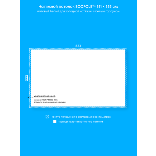 Натяжной потолок белый матовый, холодной натяжки, изготовленный по индивидуальным размерам покупателя, для помещения размером 551×333 см