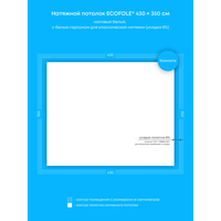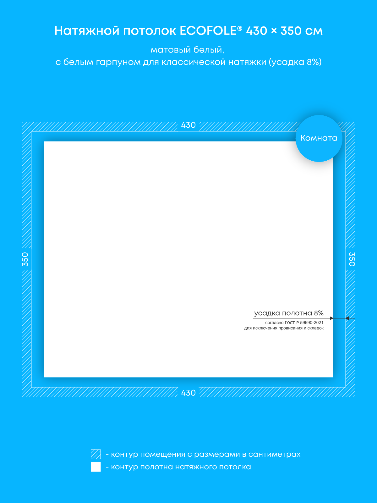 Натяжной потолок белый матовый, классической натяжки, изготовленный по индивидуальным размерам покупателя, для помещения размером 430×350 см: сравнение цен, характеристики, фото, актуальное наличие и цены.
