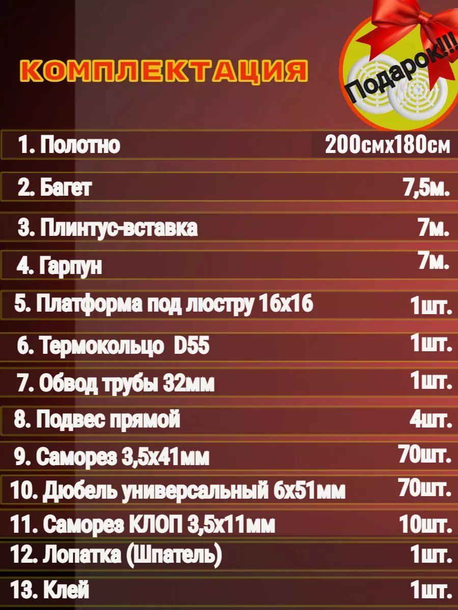 Для тех, кто не привык тратить баснословные суммы за монтаж натяжного потолка и умеет хорошо справляться с инструментом. При работе с комплектом натяжного потолка не требуется особого навыка, предлагаем уделить время на просмотр обучающего видео размещённое у нас на торговой площадке, которое сделает из вас профессионала. Нужен минимальный комплект инструментов таких как (ножовка, рулетка, карандаш, уровень(строительный или лазерный ), канцелярский нож, шуроповерт, перфоратор, молоток, стремянка, фен) . Мы предлагаем готовый набор который поможет сберечь время и деньги, а также с легкостью приукрасит вашу квартиру, дом, офис и тд. Входящий в комплект белый цвет полотна — это классическое решение для любого дизайна. . Потолочное покрытие может быть различных размеров и фактур таких как: глянцевый натяжной потолок - (отражение) , матовый натяжной потолок -(классика, вид побеленного потолка ) и сатиновый натяжной потолок - (имеет ровную поверхность и небольшое матовое отражение) , а также его легко разрезать для достижения нужной конфигурации и площади. Фактический размер полотна указан на главной странице карточки товара . Размер полотна хорошо подойдет на ванную комнату в однокомнатной квартире (хрущевке). Ванная комната - это место, где мы проводим много времени, поэтому важно, чтобы она была комфортной и функциональной. Выбирайте размер, совпадающий с размером вашего помещения (лишнюю пленку можно обрезать). Материал натяжного потолка не только удобен в монтаже, но также не прихотлив в дальнейшем использовании. Так же просим обратить ваше внимание на то что для достижения идеального эффекта обязательно нужно использовать бытовой или строительный фен , он помогает для устранения морщин и упрощает заправку полотна в направляющие . Не нашли нужного размера? Напишите запрос нам в разделе вопросы и мы откроем под вас новую карточку!