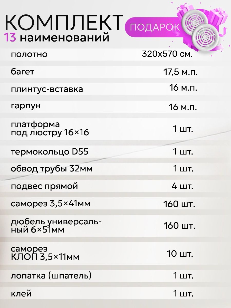 | Дополнительная информация | Полотно натяжного потолка, багет, гарпун, плинтус-вставка, платформа под люстру 16х16 см, подвесы для крепления люстры, термокольцо диаметром 55мм, пластиковый обвод трубы 32мм, суперклей, лопатка - шпатель для монтажа потолка деревянная, вентрешетки диаметр 50мм, крепеж (дюбель универсальный 6*51, саморез 3,5*41, саморез КЛОП 3,5*11) |