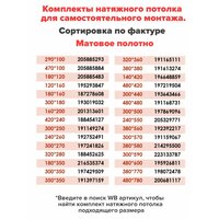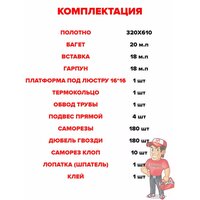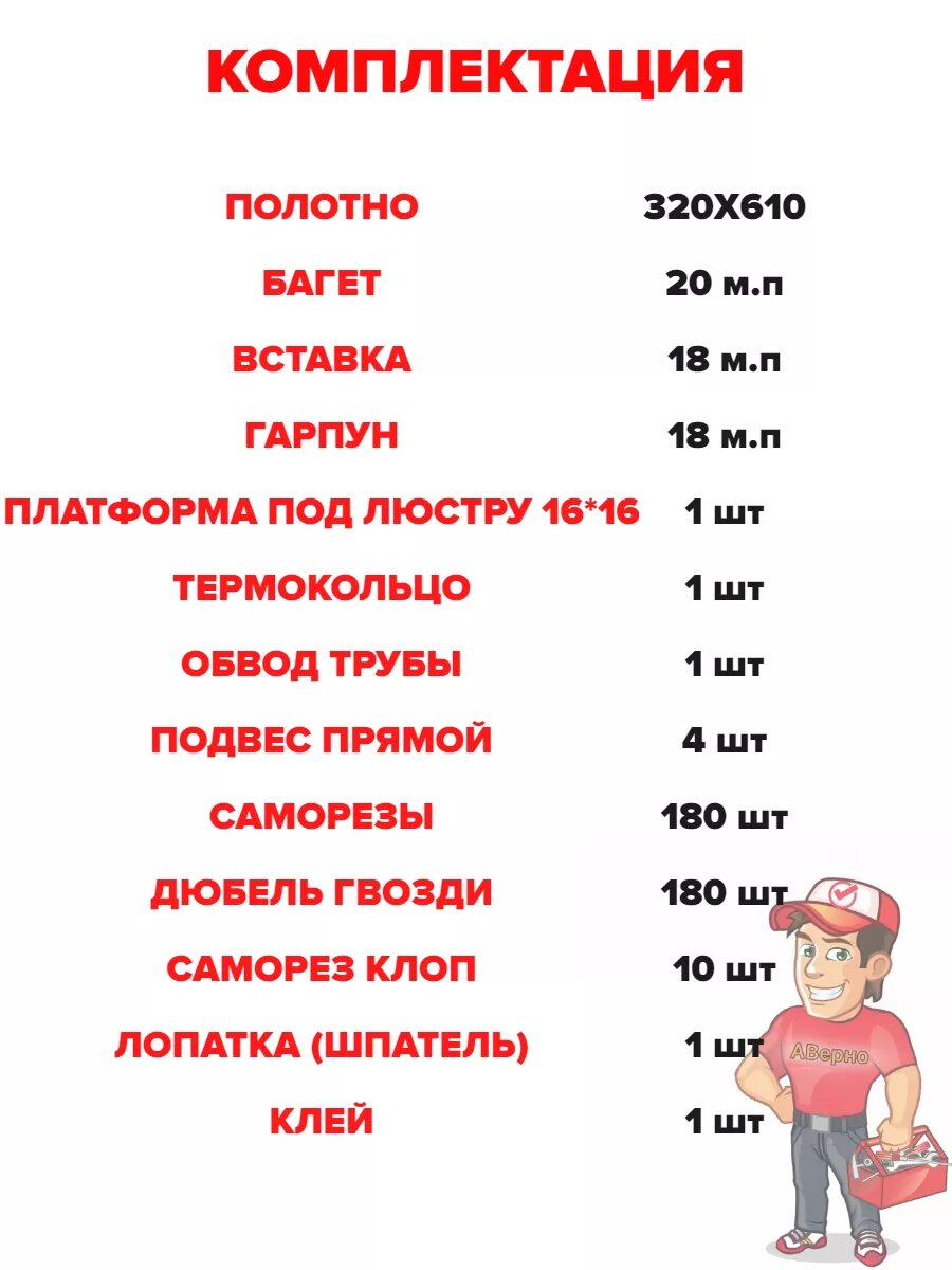 | Дополнительная информация | Полотно натяжного потолка, багет, гарпун, плинтус-вставка, платформа под люстру 16х16 см, подвесы для крепления люстры, термокольцо диаметром 55мм, пластиковый обвод трубы 32мм, суперклей, лопатка - шпатель для монтажа потолка деревянная, вентрешетки диаметр 50мм, крепеж (дюбель универсальный 6*51, саморез 3,5*41, саморез КЛОП 3,5*11) |