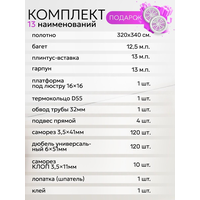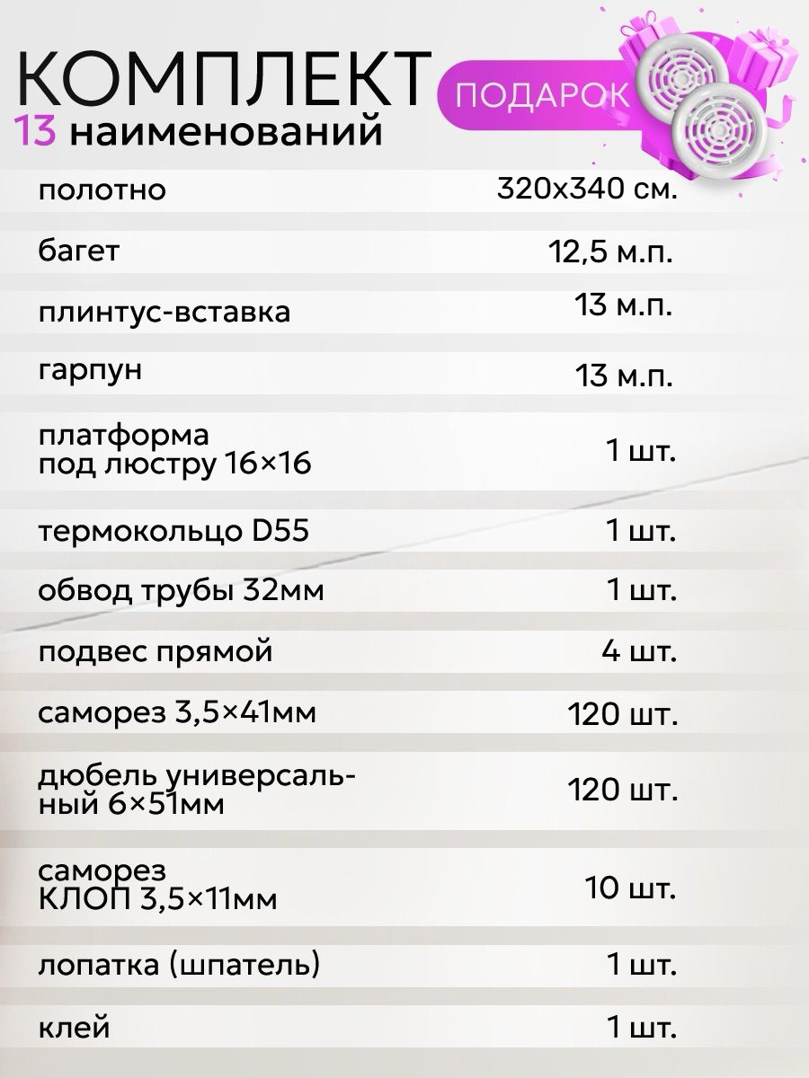 | Дополнительная информация | Полотно натяжного потолка, багет, гарпун, плинтус-вставка, платформа под люстру 16х16 см, подвесы для крепления люстры, термокольцо диаметром 55мм, пластиковый обвод трубы 32мм, суперклей, лопатка - шпатель для монтажа потолка деревянная, вентрешетки диаметр 50мм, крепеж (дюбель универсальный 6*51, саморез 3,5*41, саморез КЛОП 3,5*11) |