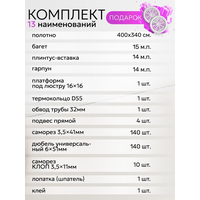 | Дополнительная информация | Полотно натяжного потолка, багет, гарпун, плинтус-вставка, платформа под люстру 16х16 см, подвесы для крепления люстры, термокольцо диаметром 55мм, пластиковый обвод трубы 32мм, суперклей, лопатка - шпатель для монтажа потолка деревянная, вентрешетки диаметр 50мм, крепеж (дюбель универсальный 6*51, саморез 3,5*41, саморез КЛОП 3,5*11) |