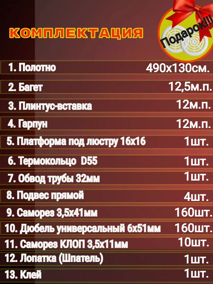 | Подробная комплектация | Полотно натяжного потолка, багет, гарпун, плинтус-вставка, платформа под люстру 16х16 см, подвесы для крепления люстры, термокольцо диаметром 55мм, пластиковый обвод трубы 32мм, суперклей, лопатка - шпатель для монтажа потолка деревянная, вентрешетки диаметр 50мм, крепеж (дюбель универсальный 6*51, саморез 3,5*41, саморез КЛОП 3,5*11) |