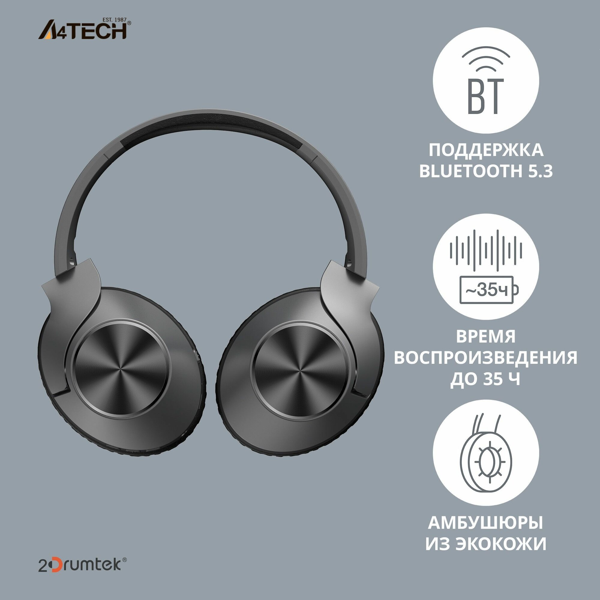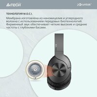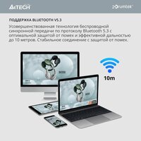 Bluetooth-гарнитура A4Tech 2Drumtek BH300 ориентирована на прослушивание музыки. Благодаря мягким амбушюрам из экокожи и регулируемому оголовью устройство исключительно комфортно. Аудиоформат гарнитуры – 2.0. Значительная (100 дБ) чувствительность наушников свидетельствует о безупречном качестве звучания. Звук воспроизводится в широком частотном диапазоне – от 20 до 20000 Гц. Входящий в оснащение гарнитуры всенаправленный микрофон демонстрирует чувствительность -42 дБ. Величина этого показателя позволяет устройству детально передавать даже шепот. Bluetooth-гарнитура A4Tech 2Drumtek BH300 универсальна: модель поддерживает два способа соединения – беспроводной (с помощью интерфейса Bluetooth) и проводной. Максимальное расстояние подключения без проводов стандартно – 10 м. Длина отсоединяемого кабеля равна 1 м. Гарнитура рассчитана на управление с помощью смартфона или планшета. В модели реализована поддержка быстрой зарядки аккумулятора. Максимальное время автономной работы гарнитуры – 35 ч.