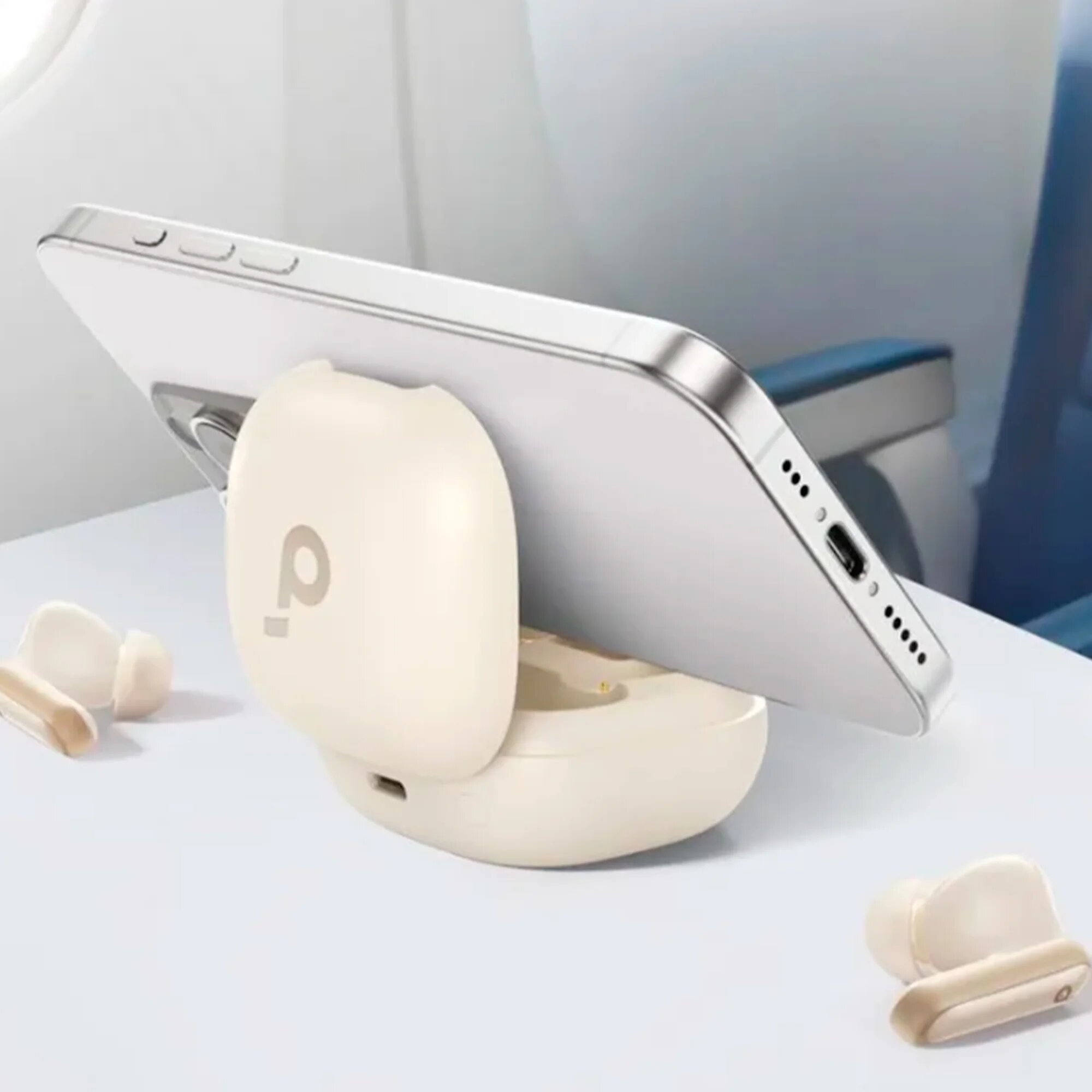 Компактный зарядный футляр устройства поддерживает быструю зарядку, а также беспроводную. Особенности конструкции кейса позволяют использовать его как подставку для смартфона. Магнитные защелки жестко фиксируют гарнитуру внутри футляра, предотвращая ее выпадение.