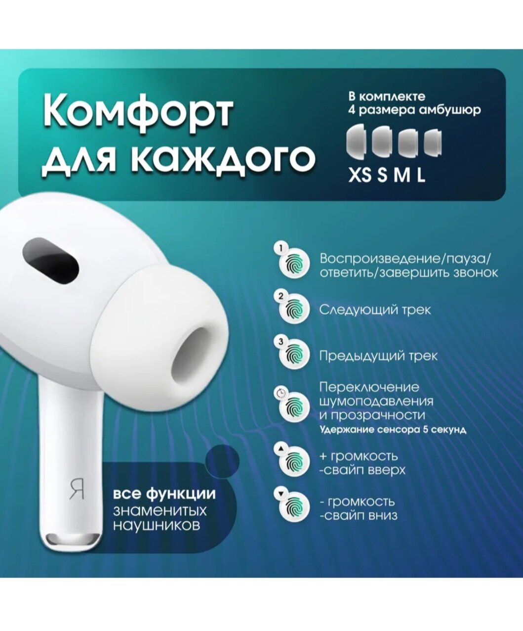 Вы получите тот же пространственный звук с динамическим отслеживанием движения головы, что и у оригинала, благодаря чему каждое прослушивание становится уникальным и объемным. Адаптивный эквалайзер точно подстраивается под вашу музыку, обеспечивая оптимальное звучание в реальном времени. Удобное управление с помощью сенсоров на каждом наушнике позволяет легко переключать треки, регулировать громкость или принимать звонки.