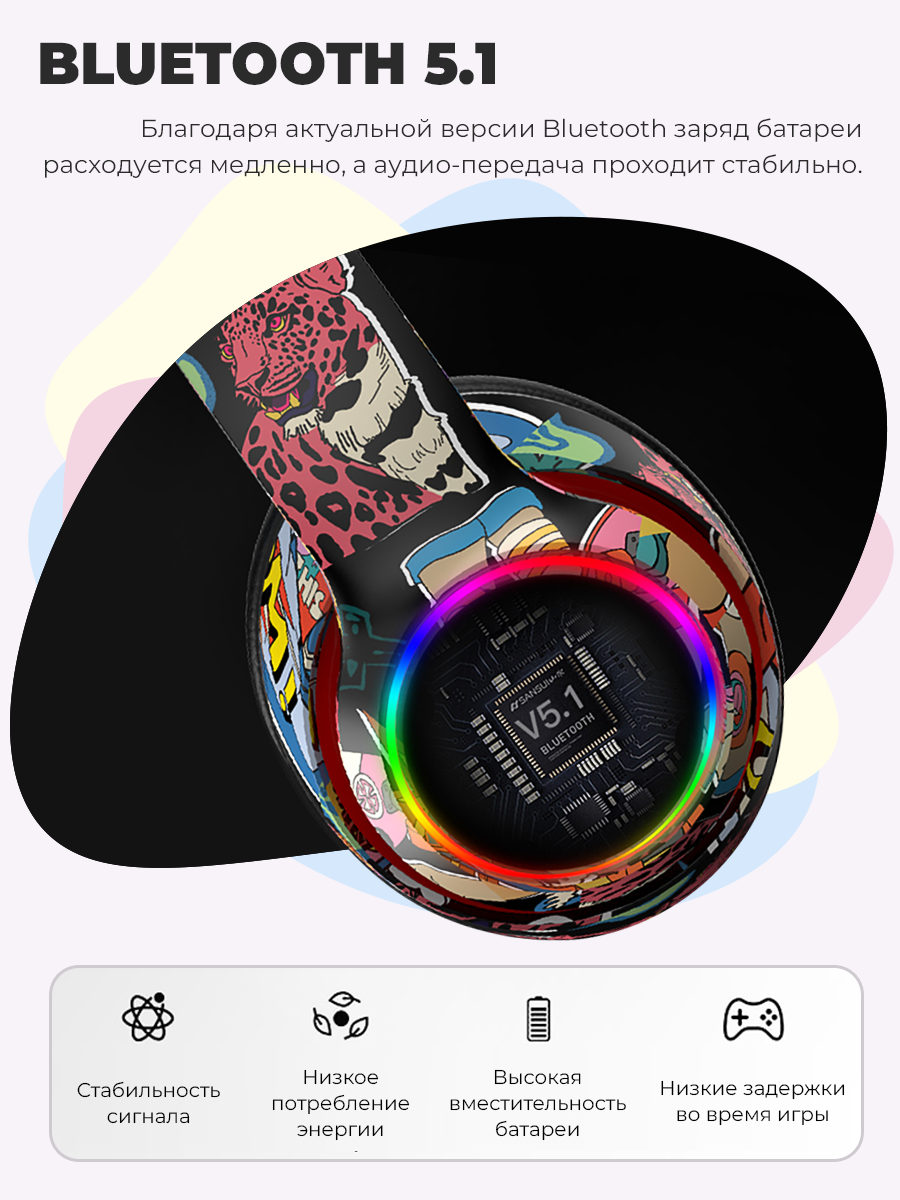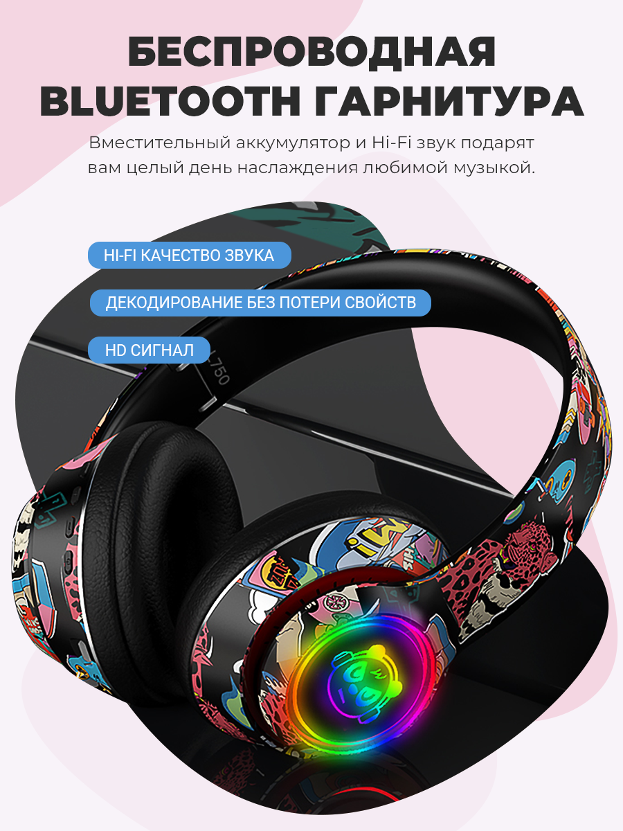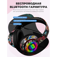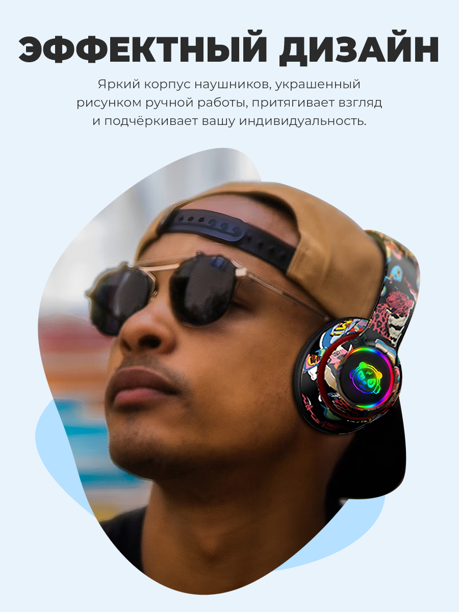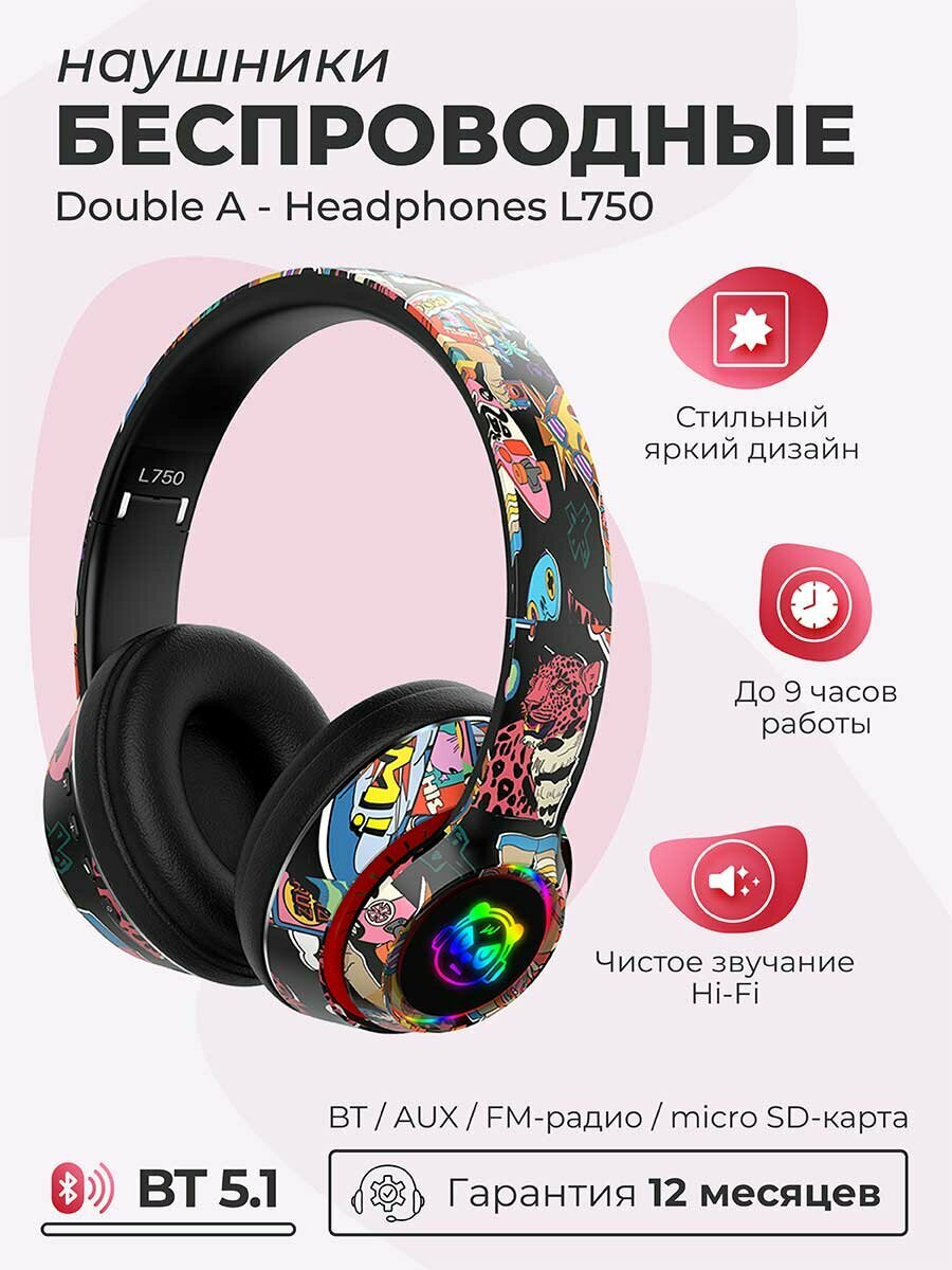 Беспроводные наушники полноразмерные Double A L750 с нанесенным вручную красивым принтом в стиле граффити и красивой веселой LED- подсветкой с внешней стороны динамиков Wireless Headphones - новые технологичные TWS наушники с шумоподавлением и 3D стерео звуком. Объём батареи обеспечивает до 9 часов беспрерывного звучания. Блютуз наушники оснащены двойными 40-миллиметровыми динамиками, обеспечивающими глубину низкочастотного звука и гарантирующими полное погружение в любимую музыку. Высококачественная графеновая мембрана воспроизводит первоначальный звук, а надежно закрытые чаши наушников с акустической пломбировкой не пропускают внешний шум и обеспечивают чистоту звука. На выбор 4 режима воспроизведения – BT/AUX/micro SD-карта/FM-радио. Наушники беспроводные поддерживают TF-карты 32 Gb. Используя эту карту можно прослушивать музыку без телефона. Имеется разъем AUX. Если у гарнитуры сел аккумулятор – достаточно подключить к ней кабель и продолжать слушать музыку. Клавиши управления на наушниках позволяют ответить на звонок либо переключить композицию, не доставая телефон из сумки или не отрываясь от игры. Современный чип BT 5.1 имеет стабильное соединение, высокоточную передачу, без задержек и перебоев связи. Также наушники отлично подходят для общения, благодаря встроенному микрофону. Большие беспроводные наушники подойдут для любого телефона с блютуз на Android, IOS, Windows (наушники для iPhone-айфона, Samsung-самсунг, Huawei, Xiaomi, Honor и др), так и для подключения к ПК, поэтому могут использоваться как игровые наушники (воспроизведение реалистичного 360-градусного звука, полностью погружающего вас в игру). Компактная складная конструкция позволяет легко сложить гарнитуру и взять с собой в поездку. В комплекте дополнительно прилагается кабель Type-C для зарядки и Audio Jack 3.5 mm для разъем AUX. Беспроводные наушники Double A L750 станут хорошим подарком на новый год, 23 февраля, 8 марта, день рождения и другие праздники. Подойдут для любого возраста. Гарантия 1 год. Себе и своим близким отличный подарок на любое событие!
