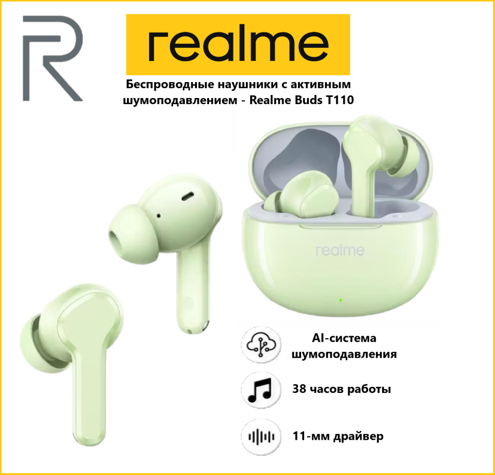 Купить Беспроводные наушники realme Buds T110, зеленые с доставкой по всей России. Беспроводные наушники realme Buds T110, зеленые: сравнение цен, характеристики, фото, актуальное наличие и цены.