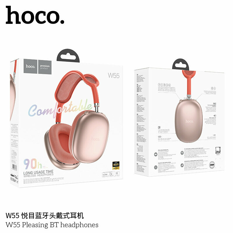 Наушники Hoco W55 имеют стильный розовый дизайн и изготовлены из прочного пластика. Они водонепроницаемы по стандарту IPX4, что делает их подходящими для использования в различных условиях.