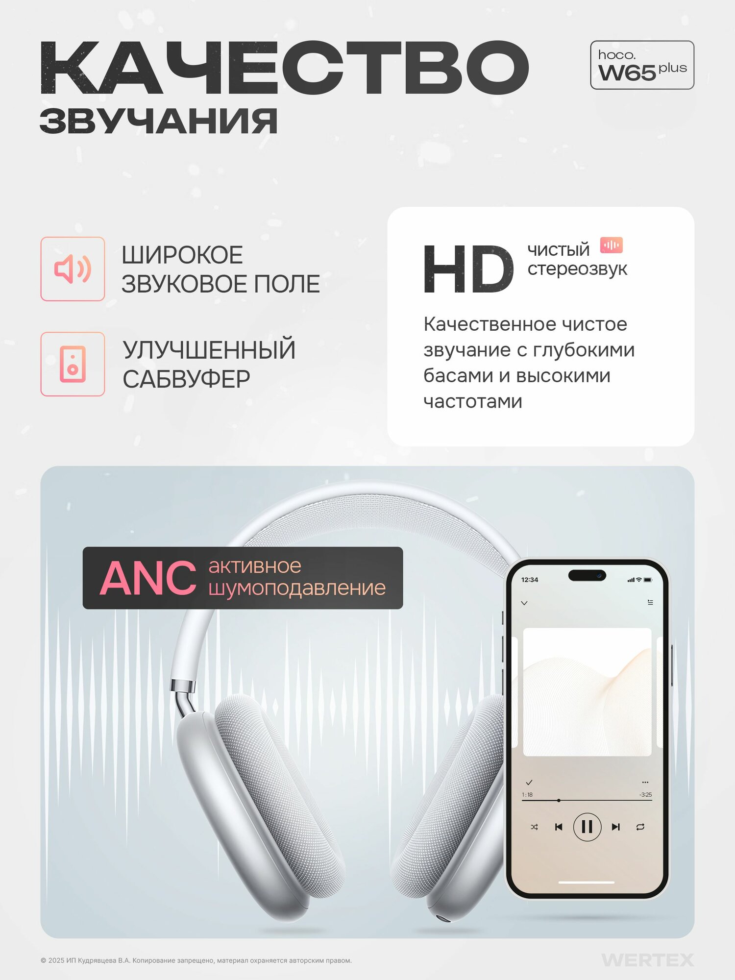 Выбирая беспроводные наушники Hoco W65 Plus Happy ANC BT headphones, вы получаете качественный звук, комфорт и функциональность в стильном серебристом дизайне.
