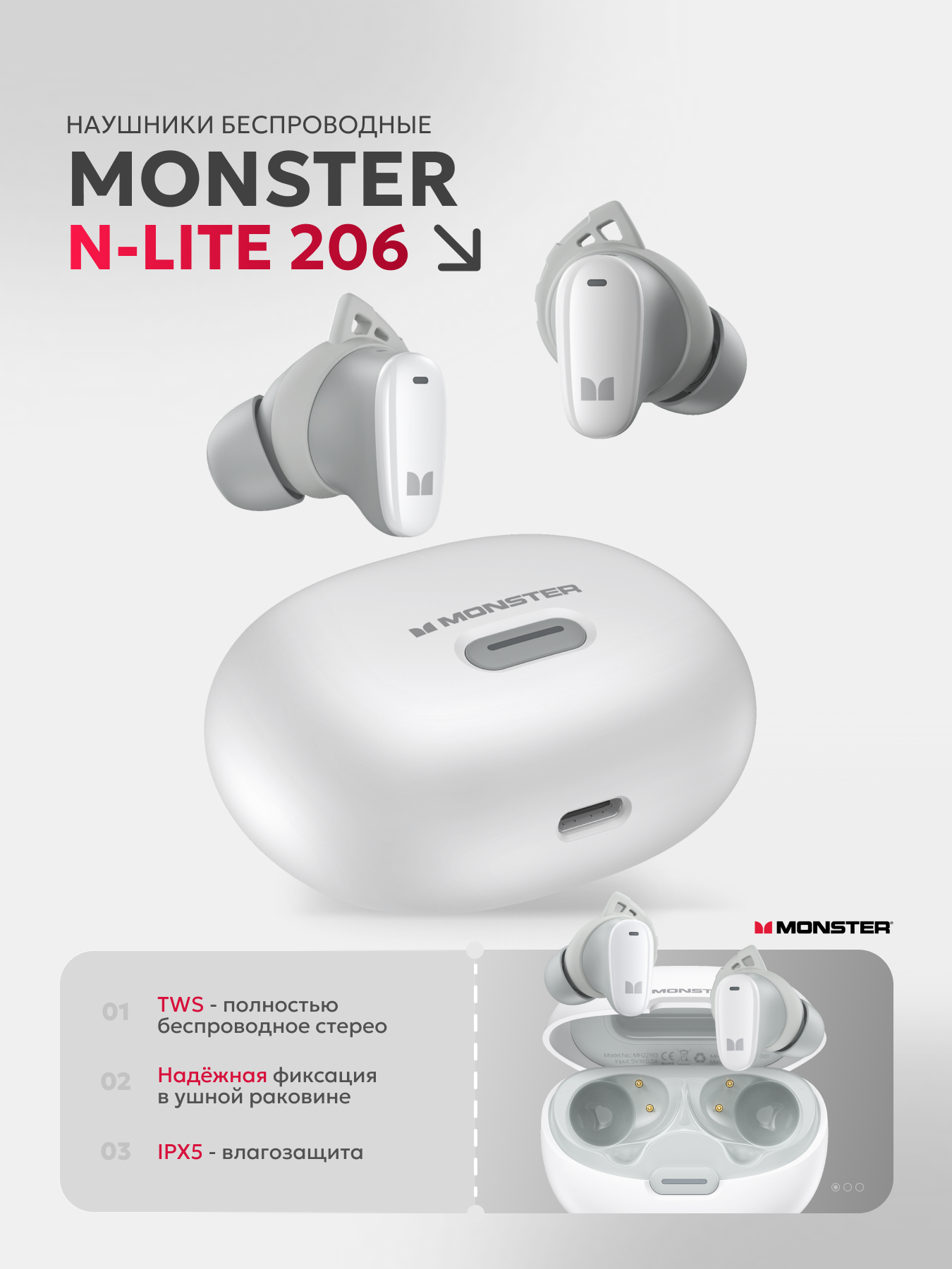 Купить Наушники беспроводные TWS MONSTER N-Lite 206, белые ( White ) с доставкой по всей России. Наушники беспроводные TWS MONSTER N-Lite 206, белые ( White ): сравнение цен, характеристики, фото, актуальное наличие и цены.